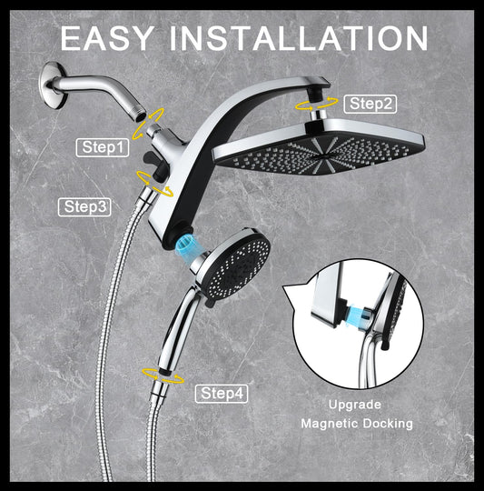 High Pressure Rain Shower Head Combo, Fixed & 10-Spray Handheld with Magnetic Docking, Detachable Power Jet Showerhead Upgrade