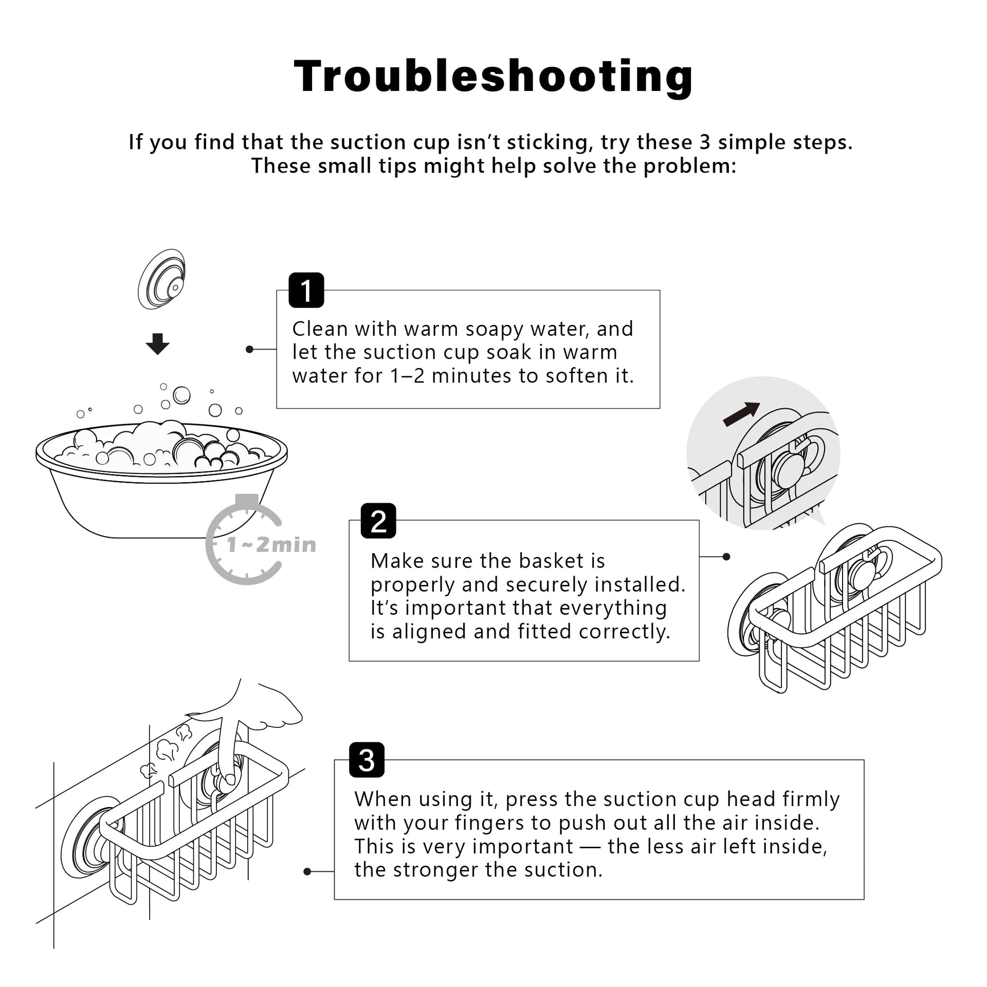 - Easy Tips for Better Suction If the suction cup isn’t sticking, try these: 1.Clean both the surface and suction cup with warm soapy water. 2.Soak suction cup in warm water for 1–2 minutes to soften. 3.Press suction cup head firmly to remove air bubbles. 4.Ensure installation on flat surfaces, not corners or curves.