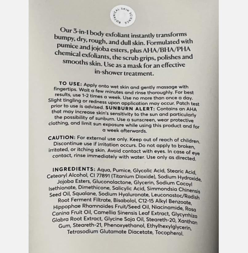 Details: Our 3-in-1 KP body scrub exfoliant instantly transforms bumpy, dry, rough, and dull skin. Formulated with pumice and jojoba esters, plus AHA/BHA/PHA chemical exfoliants, the scrub grips, polishes and smooths skin. Use as a mask for an effective in-shower treatment. Developed for most skin types.