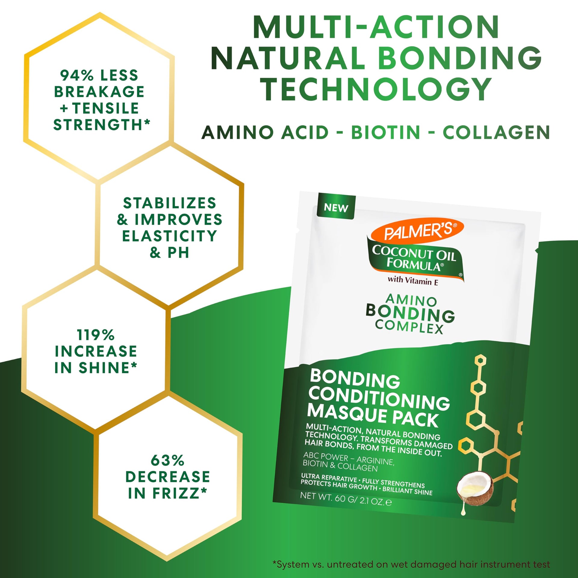 Details: Palmer's Hair Mask, Amino Bonding Complex Intense Conditioning Masque Pack with Coconut Oil & Vitamin E, Hydrating, Heat Protectant, Anti Frizz, Adds Shine, Protects Hair Growth, All Hair Types This highly concentrated masque is uniquely formulated with nourishing ingredients, including Coconut oil, Vitamin E and essential nutrients to deeply nourish, enhance moisture, and seal in hydration. Powered with Amino Acid (Arginine), Biotin & Collagen, the bonding hair mask maximizes tensile strength, provides lasting protection, adds brilliant shine and softness. Our heat protectant hair treatment masks shield your hair from styling damage, providing an additional layer of heat protection up to 450 degrees. This ultra-reparative hair mask helps control frizz, breakage and split ends. Whether you have curly, straight, or fine hair, this hair bonding treatment promotes growth and thickness, making it a great addition to your hair care routine. How It Works This bonding complex penetrates to the hair’s cortex, helping to support the keratin structure and reinforce damaged hair bonds. With each use, hair becomes stronger, shinier, softer, and bouncier, while minimizing further damage. Suggested Use After shampooing, coat hair from root to tip. Massage or comb through, wait 5-10 minutes, then rinse.