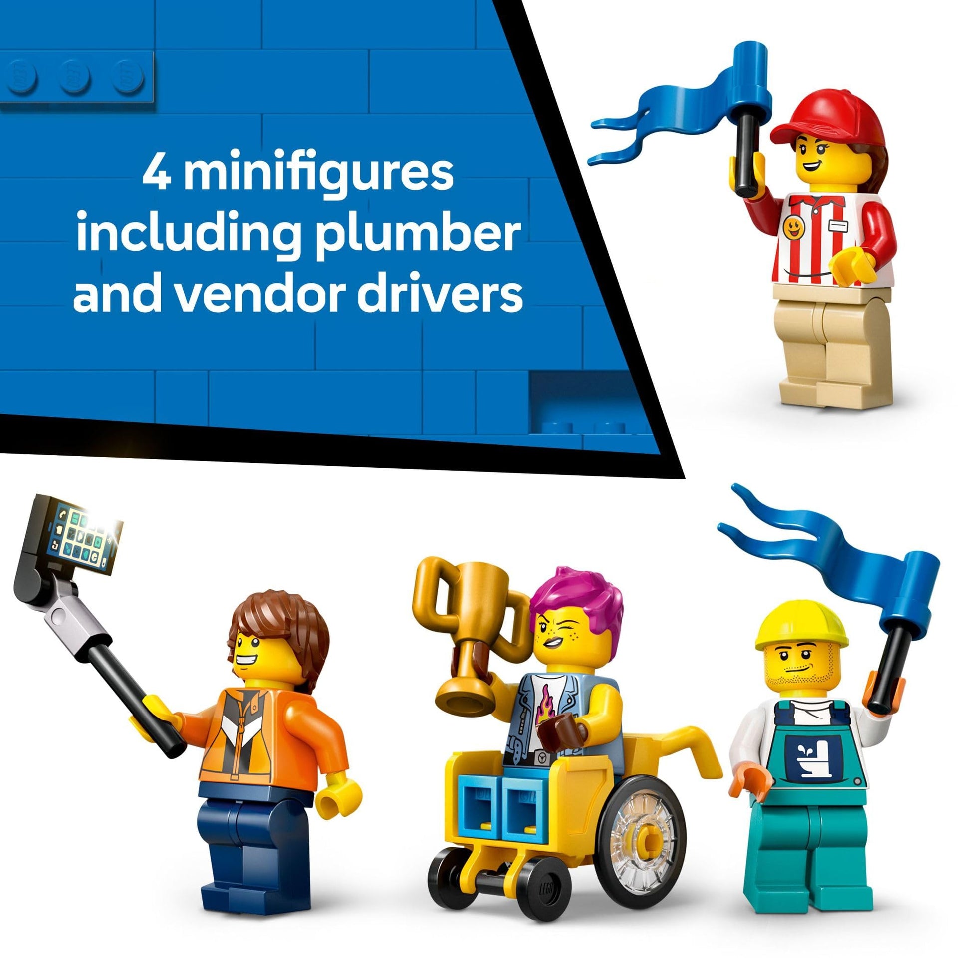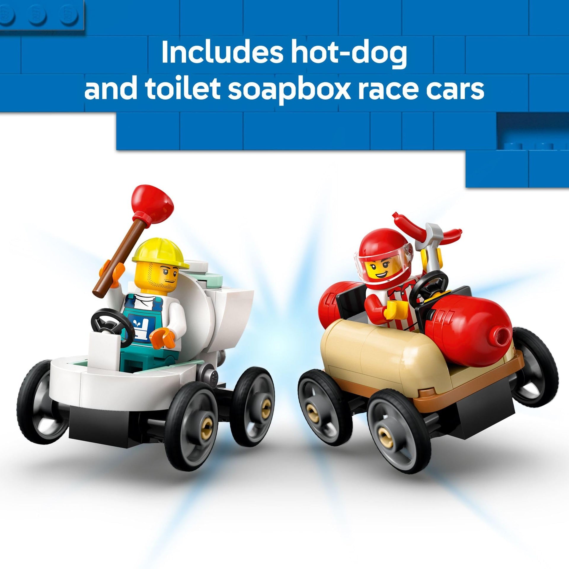 - TOY FIGURES & PLAYSET – Everything boys and girls need to build a toy car ramp, hot dog and toilet soapbox cars, plus 4 minifigures including a hot-dog vendor and plumber drivers