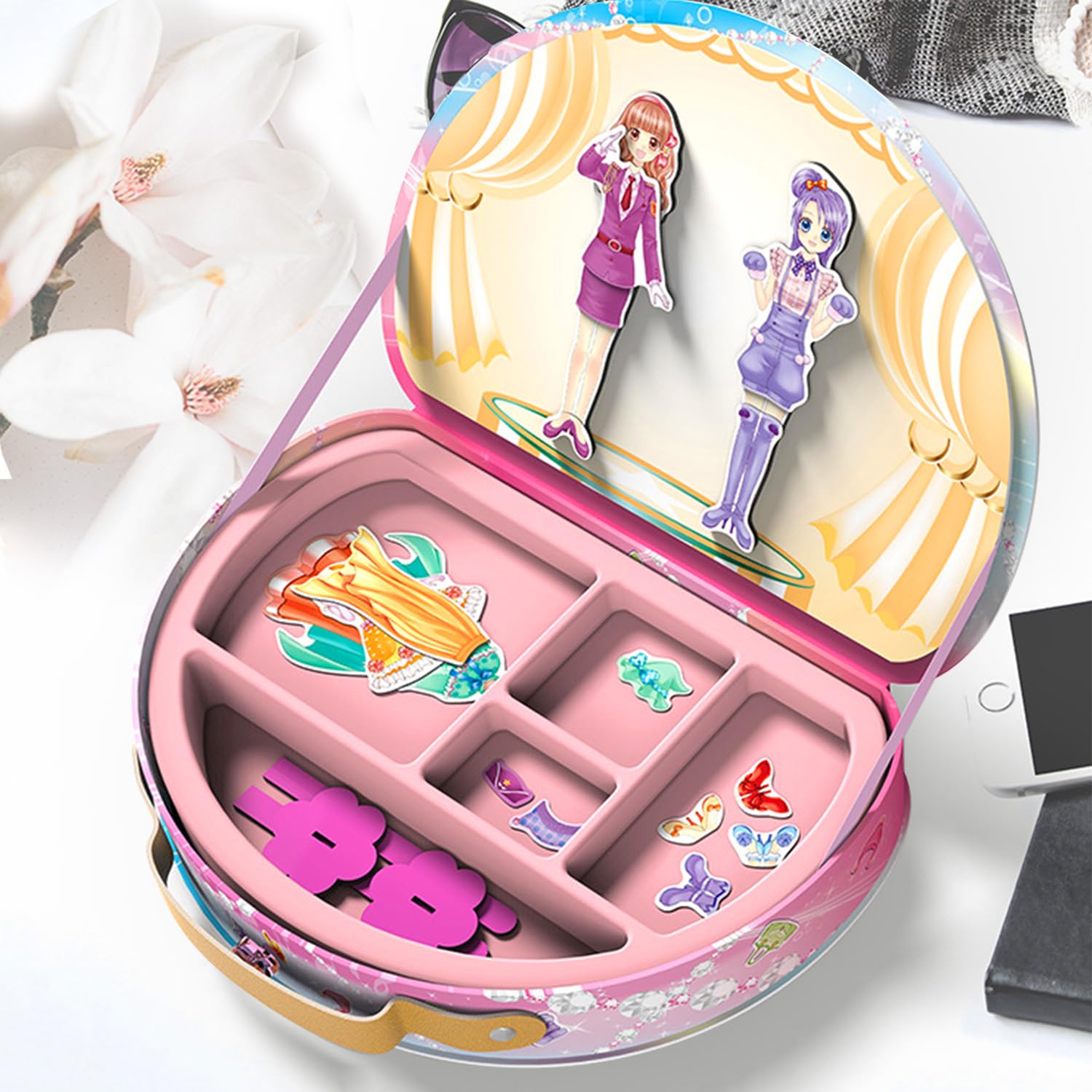 Details: Magnetic dress up doll playset including a wardrobe, 2 magnetic paper dolls, 2 doll stands and tons of beautiful magnetic clothing and accessories such as dresses, tiaras, hats, bags bag, shoes. Can mix and match with each other to create different clothing styles and wonderful fashions, a must-have for little girls who like to dress up!