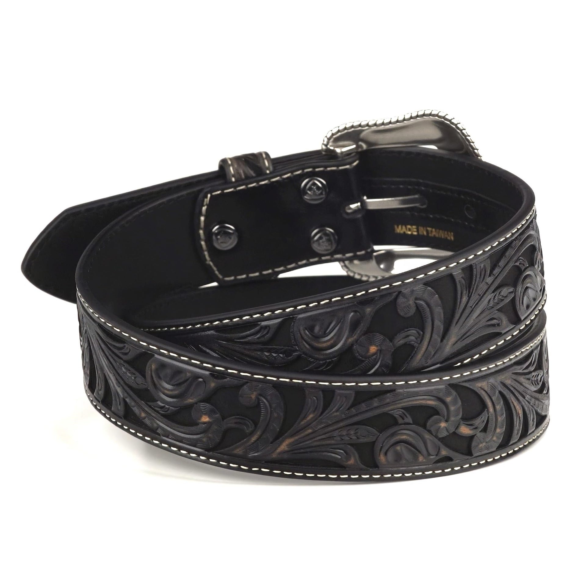 Crafted for everyday wear with true Western character, this Ariat ladies belt pairs a floral-embossed leather overlay with a black roughout underlay for rich depth and contrast. The 1-1/2" strap slides easily through standard belt loops, and an antique silver buckle finishes the look. For sizing, measure from the buckle end of the strap to the center of the middle hole (the 3rd of 5 holes), then choose the size that matches; as a rule of thumb, order a belt about 2" larger than your waist/pant size. Belt lengths: Small 30", Medium 34", Large 38", X-Large 42".
