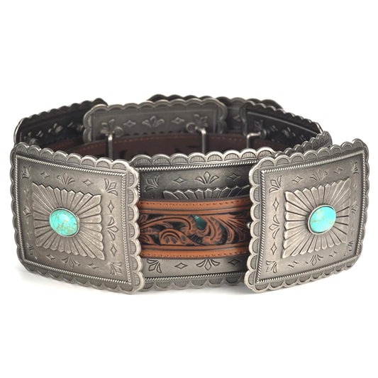 ARIAT Women's Floral Pierced Leather Turquoise Underlay Belt, Tan, Medium