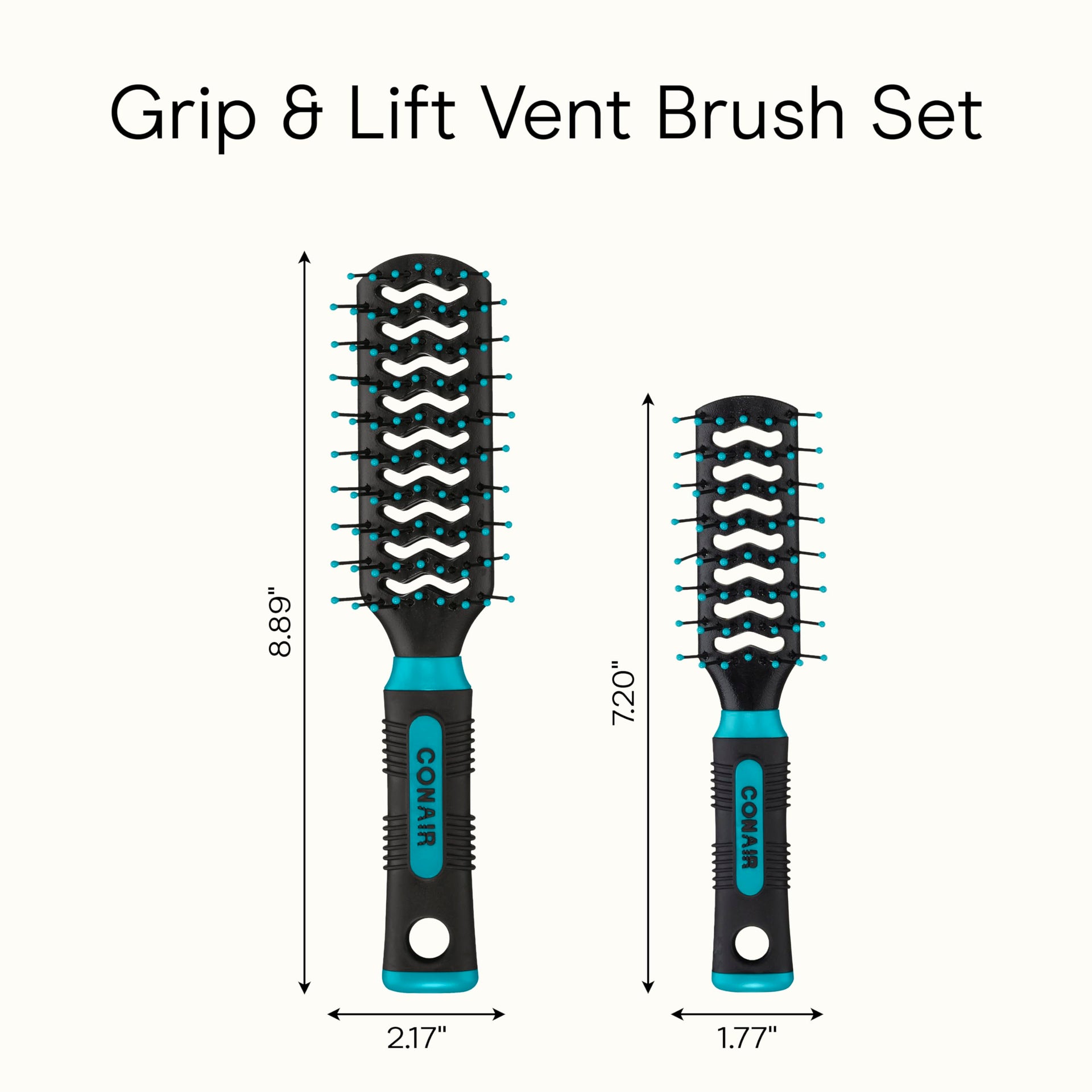 Details: For beauty touch-ups on the go, try the Conair® Grip & Lift Vent Hairbrush Set. The compact purse-size hair brush is perfect for travel, just pop it in your tote, travel bag, or makeup bag and go. Both hair brushes feature a vented design to speed up blow-dry time and boost volume while helping to shape styles. This Conair® hair brush works well on wet or dry hair. Ball-tipped nylon bristles glide through your tresses without snagging or pulling. The grooved handle gives you a secure, nonslip grip. These brushes help you blow-dry, style, and smooth your hair with confidence for salon-style finish. Contains 1 full-size and 1 mid-size vented brush.