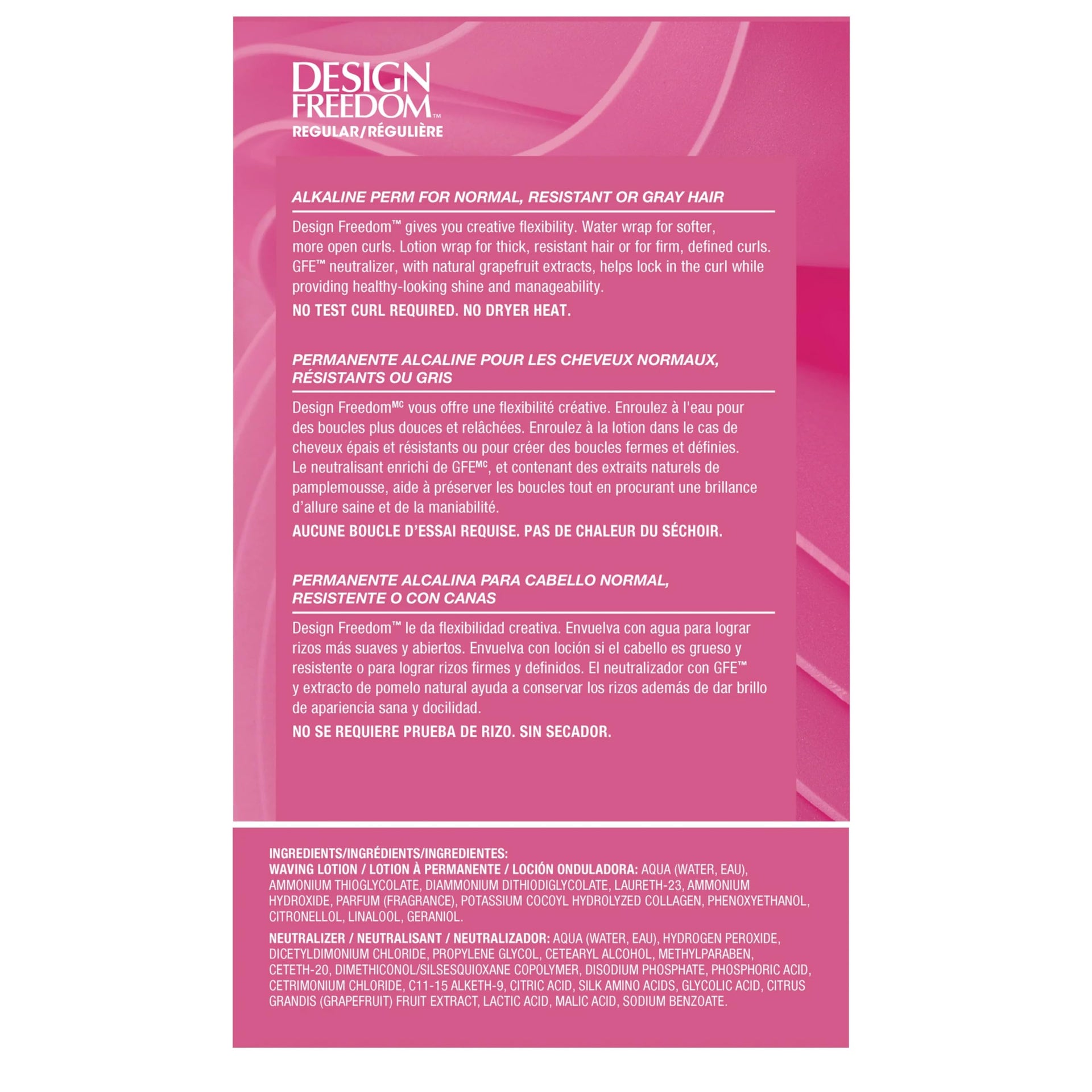 Details: Design Freedom Regular Alkaline Perm for Normal, Resistant or Gray Hair gives you creative flexibility. Contains GFE enriched neutralizer leverages natural grapefruit extracts to lock in the curl while providing both shine and manageability.