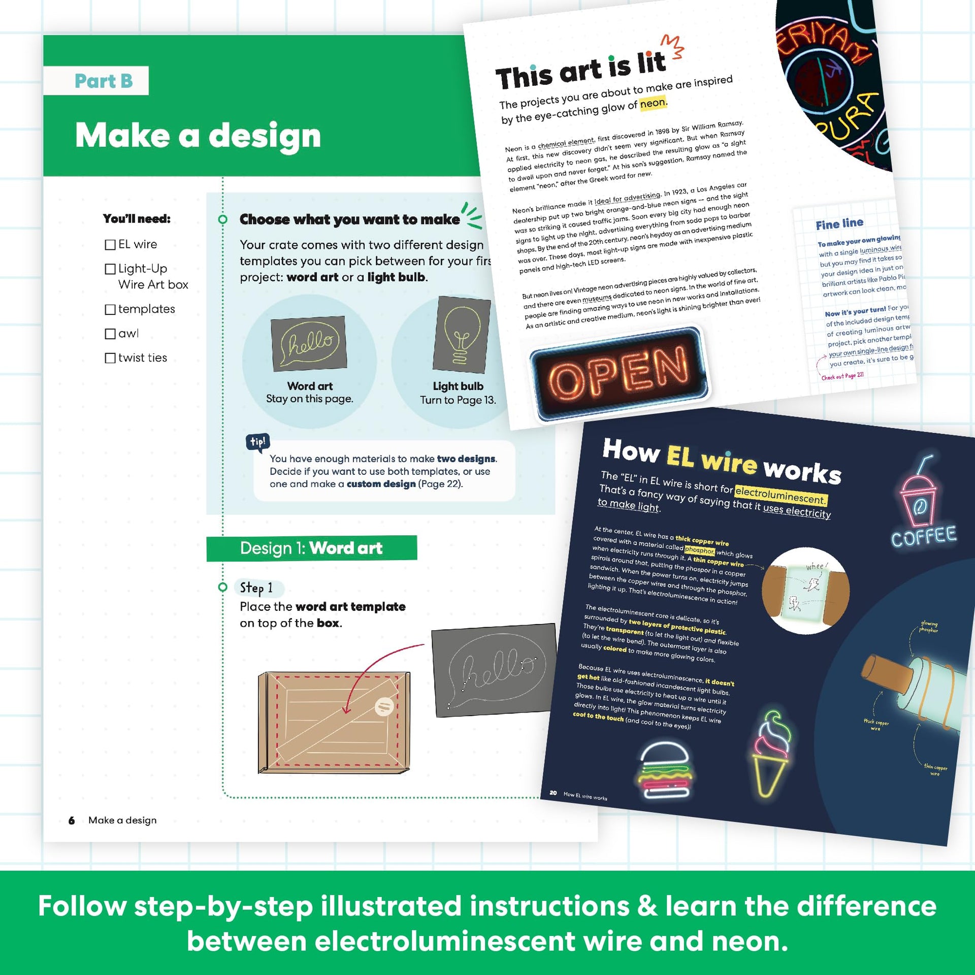- REAL-WORLD SCIENCE: This art is lit! Create two battery-powered light-up signs with electroluminescent (EL) wire for brilliant room decor. This crate comes with everything you need to get your glow on, including EL wires, battery packs, five design templates, hang tabs, an illustrated instruction booklet, and more.