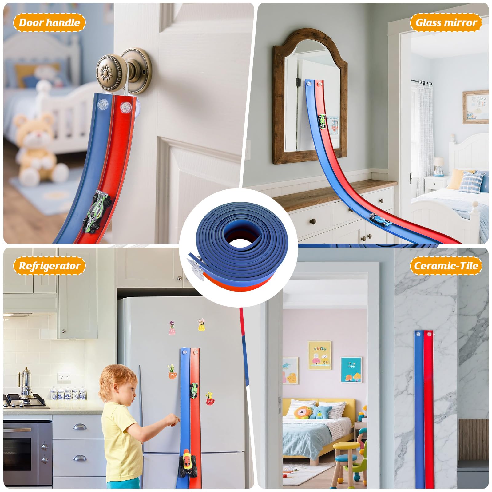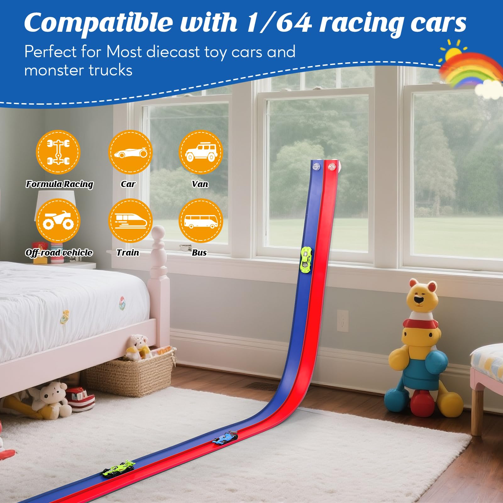 Flexible 15ft Race Car Track Starter Set with Suction Cups & 1:64 Diecast Cars, Blue & Red Double Track, Rolls Up for Kids 3+