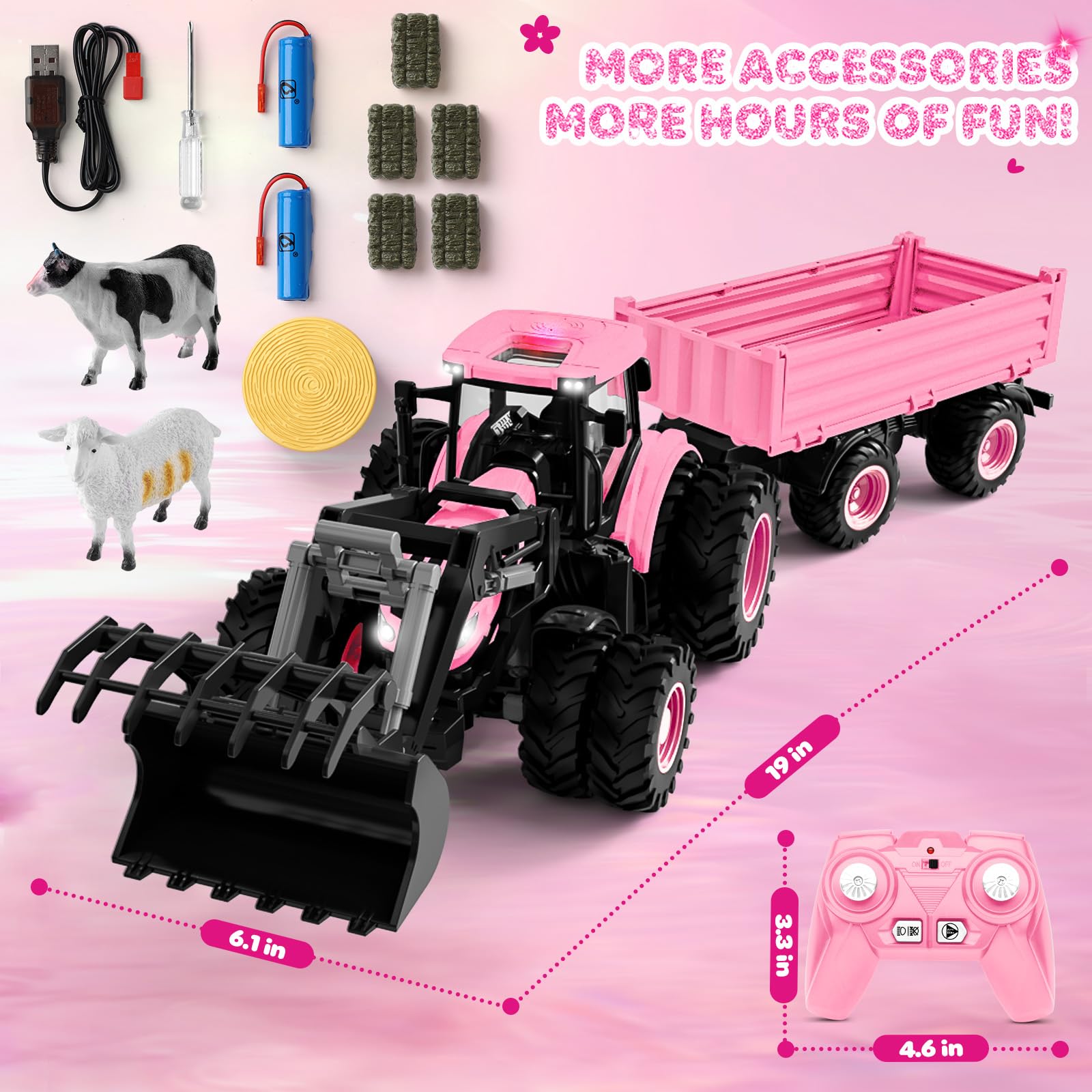 Remote Control Tractor Toy 2025 – RC Tractor, Truck & Trailer with Front Loader, 8-Wheel Lights, Metal Farm Vehicle for Kids 3-9, Pink Gift