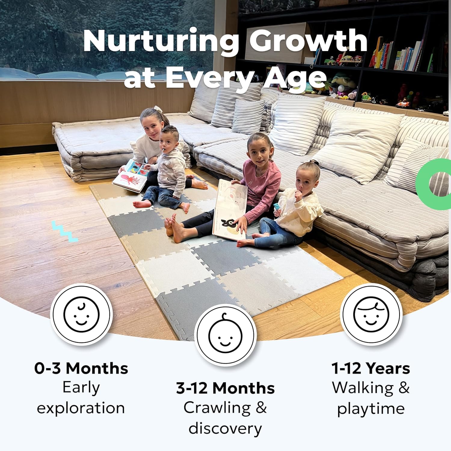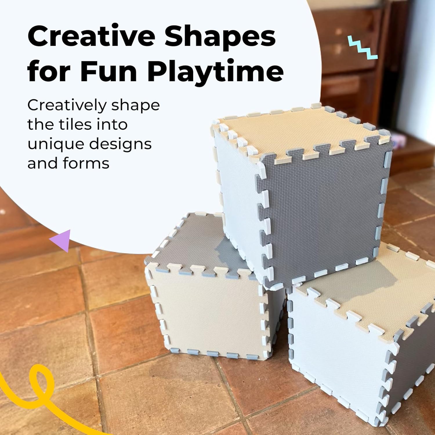 - 😴 EASY-TO-ASSEMBLE INTERLOCKING FOAM TILES: Our 12.4 x 12.4-inch interlocking foam tiles fit securely together, creating a customised play area for any room. Choose from our 16-piece set (covers 16 sq ft) or 36-piece set (covers 36 sq ft), each with matching borders for a polished look.