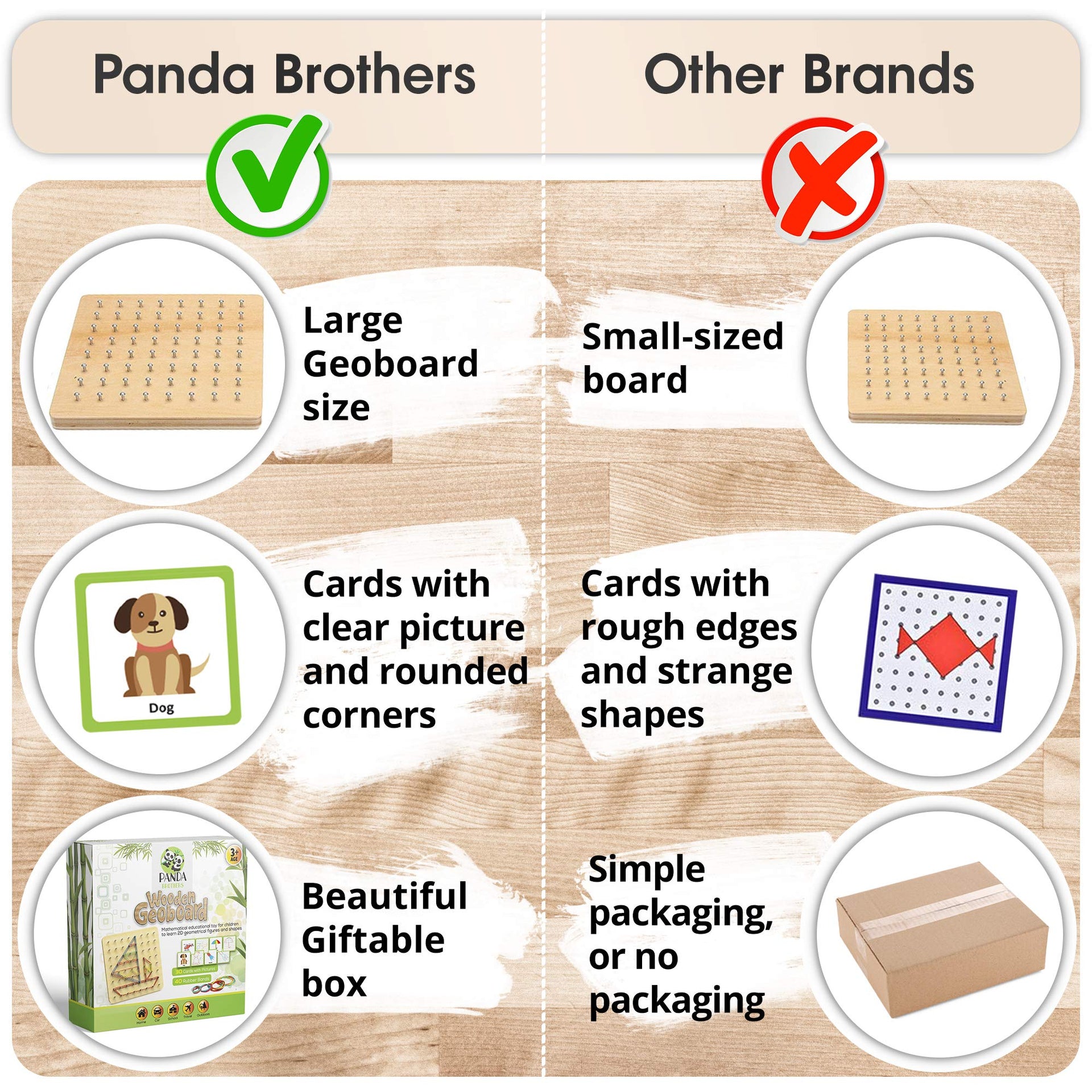 Panda Brothers Wooden Geoboard โ€“ Montessori STEM Toy for Kids Ages 3-5, Includes 30 Pattern Cards & 40 Rubber Bands for Creative Learning