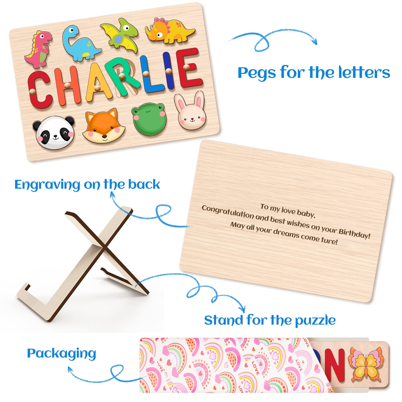 - 【Personalized Name Puzzle】A Personalized Wooden Name Puzzle just for your kids. You could customize the name and pattern you want, each letter is painted with a stunning color that both boys and girls will love, each animal pattern is very vivid and cute