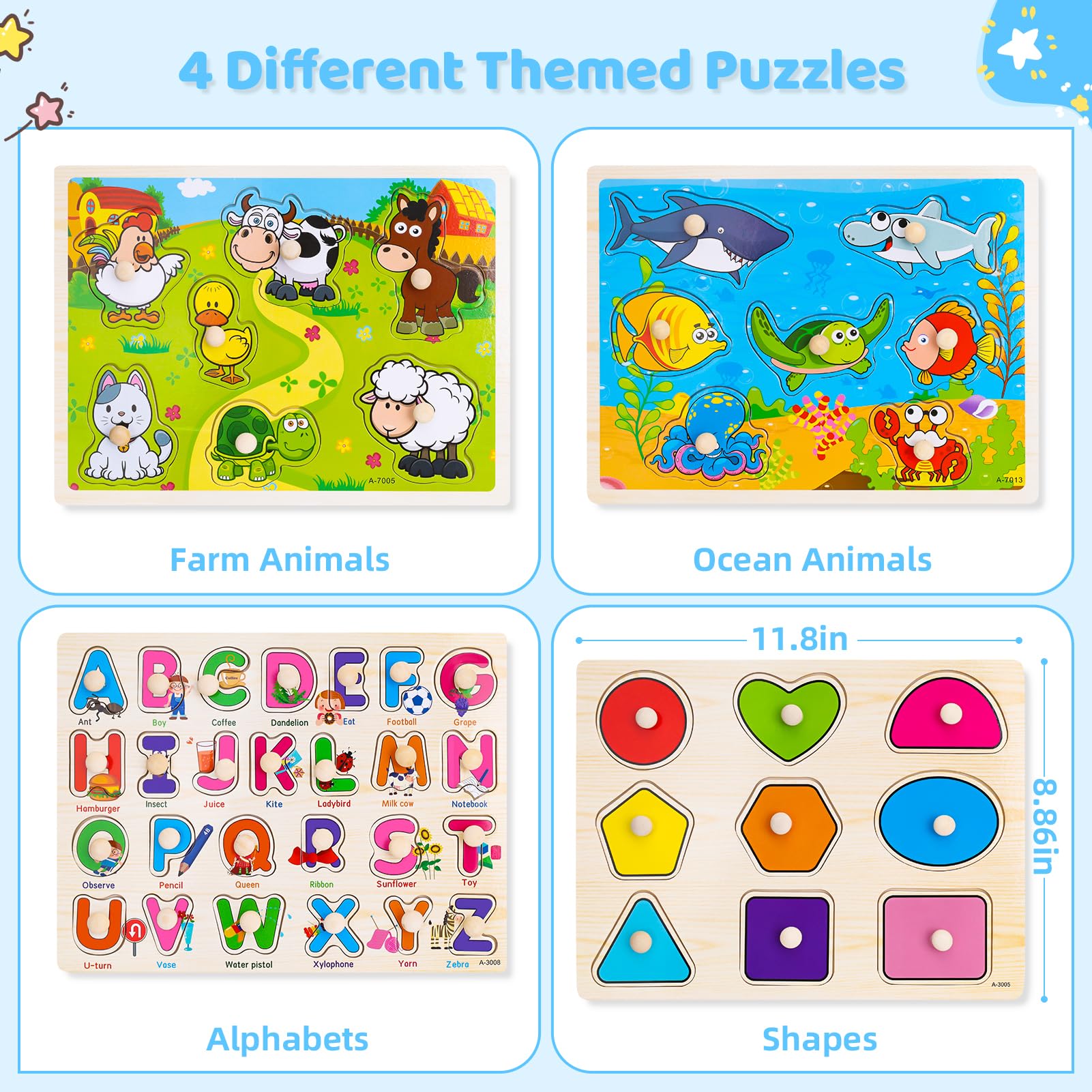 - 【4 Pack Valued Toddler Puzzles Set】Our wooden puzzles set includes an alphabet puzzle with 26 pieces alphabet, a shape puzzle with 9 pieces different shapes, a marine animal puzzle with 7 pieces sea animals, and a farm animal puzzle with 7 pieces animals. We considered the fun and learnable nature of toddler learning toys. The toddler puzzles ages 2-4 are perfect for helping kids develop their intelligence and build early learning skills.
