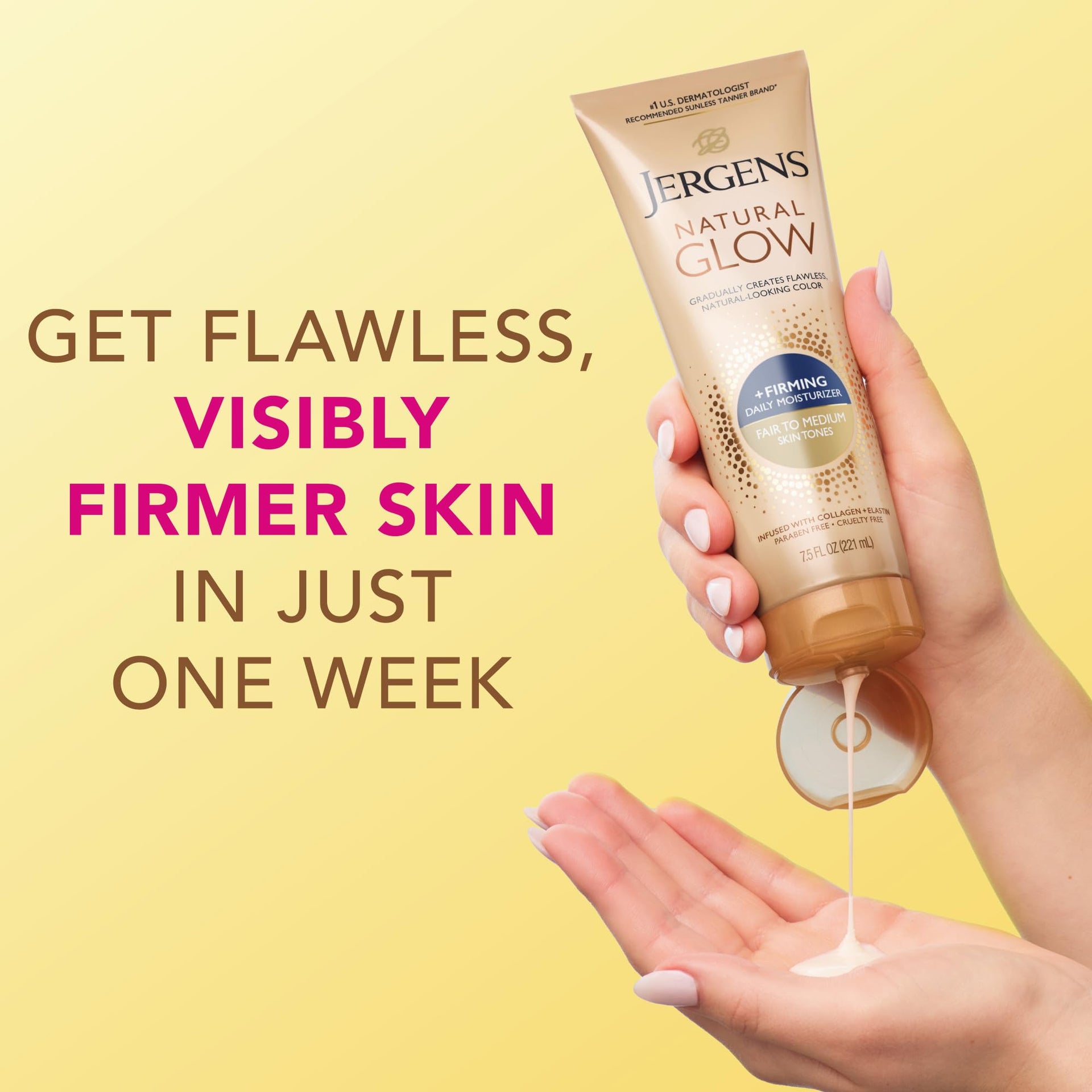 Details: Applying this self tanning daily body lotion can achieve a flawless, natural looking glow and help reduce the appearance of cellulite. Jergens Natural Glow +FIRMING Daily Moisturizer for Fair to Medium, lighter, fairer skin, gradually delivers subtle, streak-free color and reduces the appearance of cellulite in as little as 7 days. To enhance your natural skin tone, apply in place of your regular body moisturizer at least once daily and you'll have beautiful, natural looking color in about one week for fair skin tones. Jergens Natural Glow +FIRMING Daily Moisturizer for fair to medium skin tones improves the look of cellulite. Anti cellulite cream visibly reduces cellulite on lighter skin tones. Collagen moisturizer tightens skin and improves elasticity for optimal skin health and moisture. It is infused with a blend of collagen, elastin and polymers and spreads over skin to give it a smoother look. The moisturizer by Kao USA also contains a blend of hydrating ingredients and antioxidants. Your skin stays nourished while getting its glow on without the unpleasant sunless tanning odor - just a light, fresh scent. Satisfaction Guaranteed. Limitations may apply.