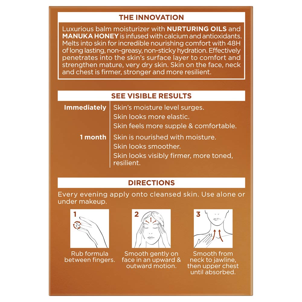 Details: L'Oreal Paris Age Perfect Hydra-Nutrition Night Balm comforts dry skin, firms skin and improves resilience and tone. Age Perfect Hydra-Nutrition Night Balm Face Moisturizer with Manuka Honey Extract intensely nourishes & strengthens dry skin so its more elastic. Enriched with Calcium and Essential Oils, its specially designed for Dry Skin. It offers 48 hour hydration and comfort. Skin is left firmer and more resilient.