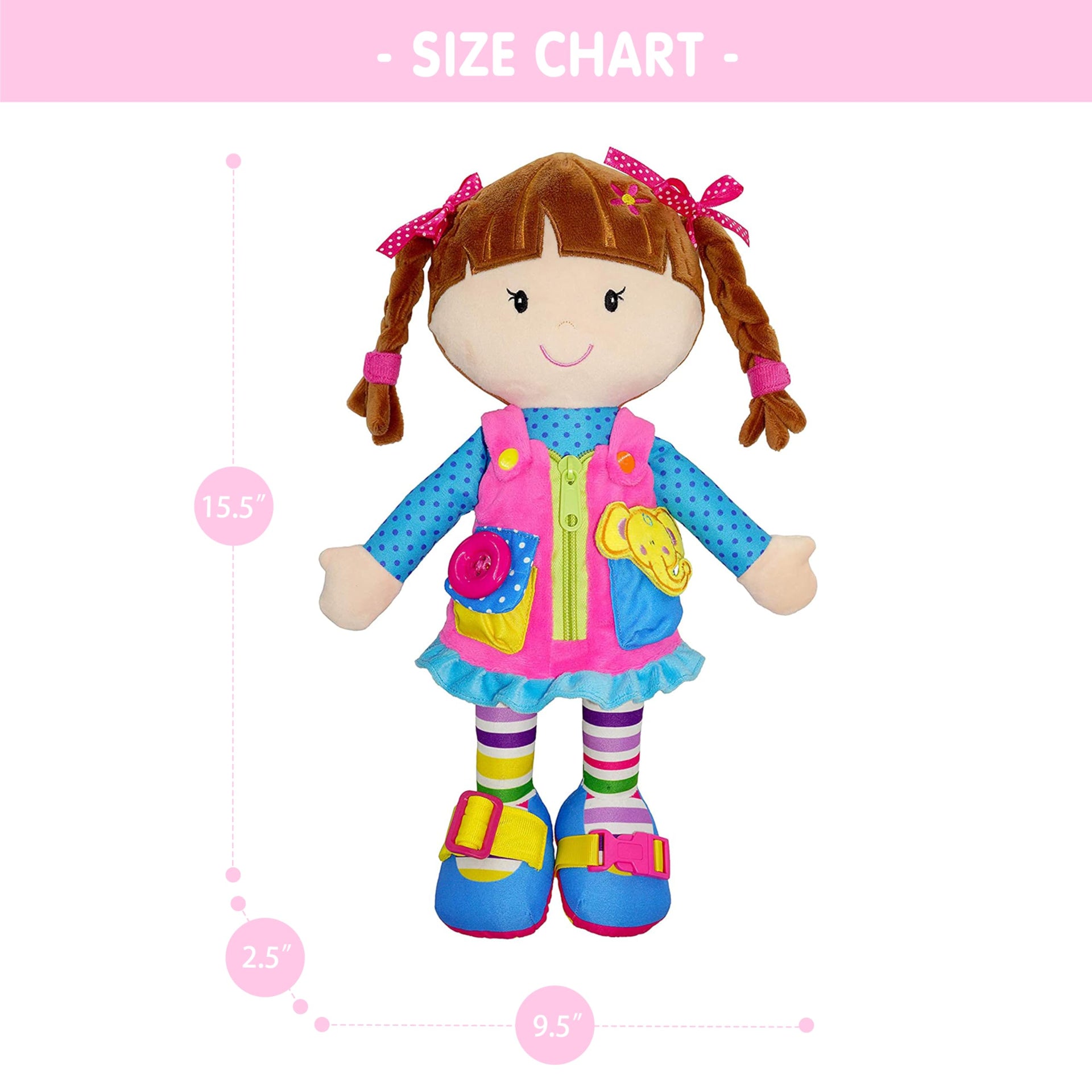 June Garden 15.5" Dressy Friends Belle - Educational Stuffed Plush Doll for Kids and Toddlers 2 Years and Up - Montessori Buckle Soft Toy