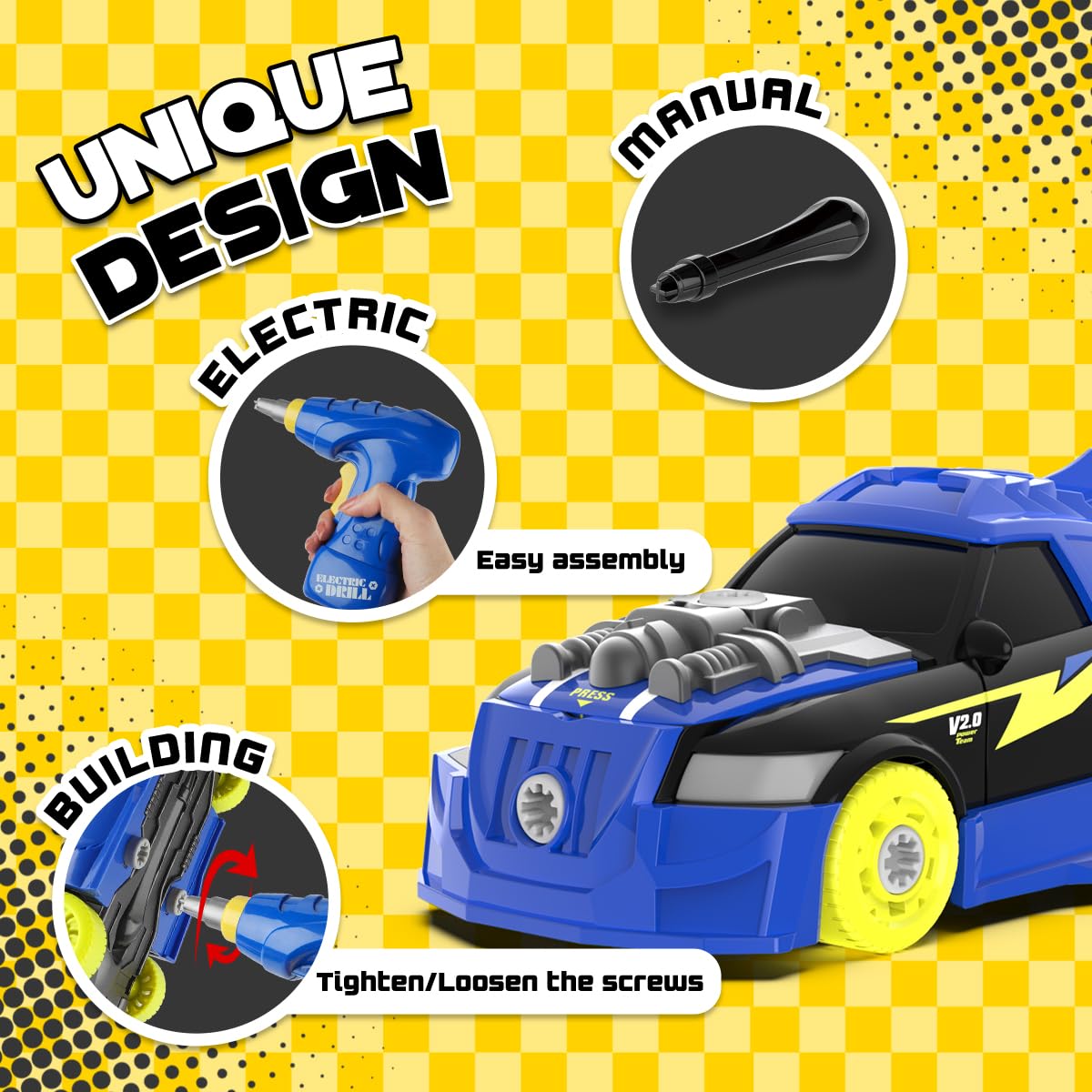 - Young Engineers: The 26 pieces assembly racing car toy comes with drill, tires, screws and car parts, allow kid to assemble, take apart, reassemble, fix and repair, and they can build it on their own hands and then play with it