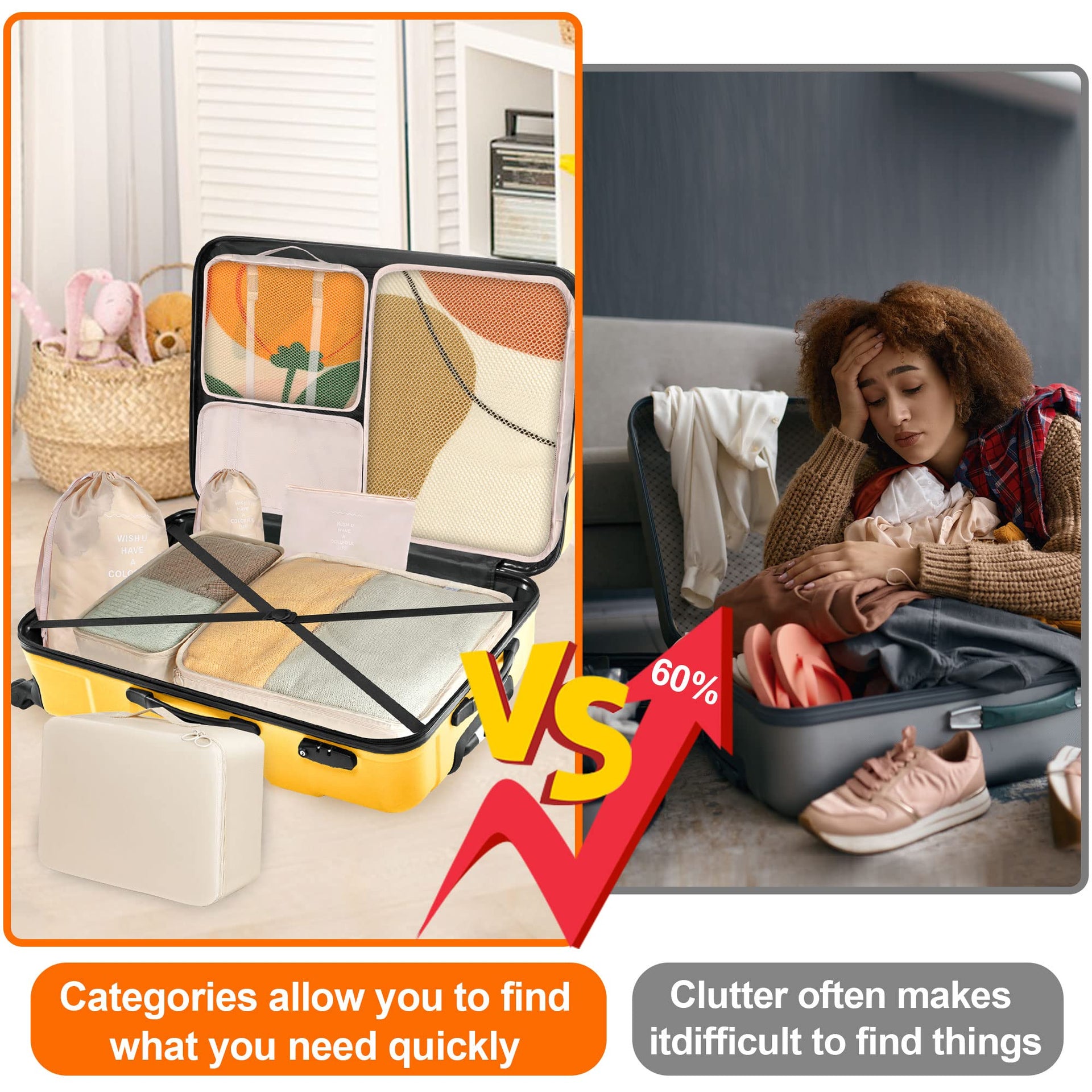 - Quality Fabrics:Mesh top panel, easy to identify content and ventilate these cubes will go a long way. There are no broken zippers, no weak stitches. The smooth fabric protects your clothes from wrinkles and stains. High-performance features ensure that the packaging cube can withstand high-density wear during travel. The waterproof function protects your clothes from splashes or leaks.
