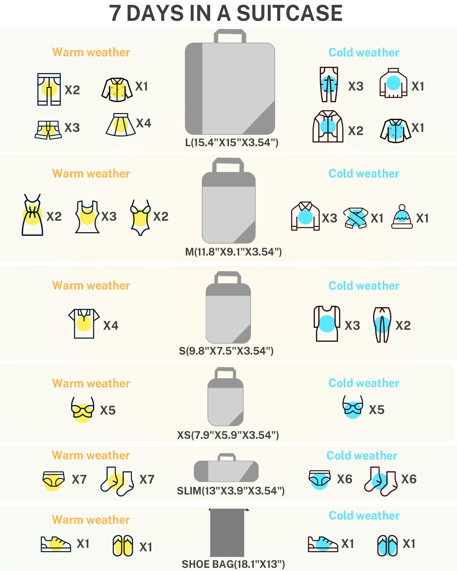 - Set Includes: 1*Large (39x38x9 cm /15.4x15x3.54 inches), 1*Medium (30x23x9 cm /11.8x9.1x3.54 inches), 1*Small (25x19x9 cm /9.8x7.5x3.54 inches) , 1*Smallest (20x15x9 cm /7.9x5.9x3.54 inches), 1*Slim (33x10x9 cm /13x3.9x3.54 inches), and 1*Laundry bag (46x33 cm/18.1x13 inches)