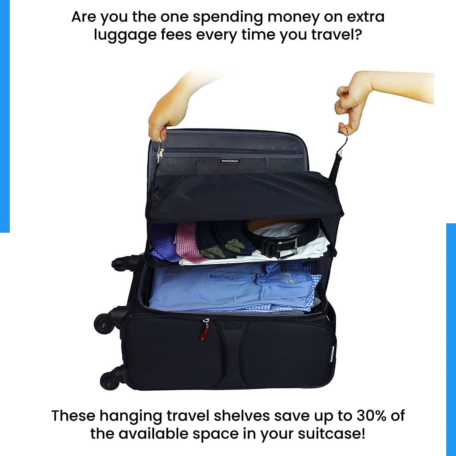 - ✅ Portable Hanging Travel Shelves – Unpack Without Unpacking Turn your suitcase into a mobile closet. The Stow-N-Go hanging travel organizer lets you unpack instantly — just hang, access, and go. No digging through your bag.