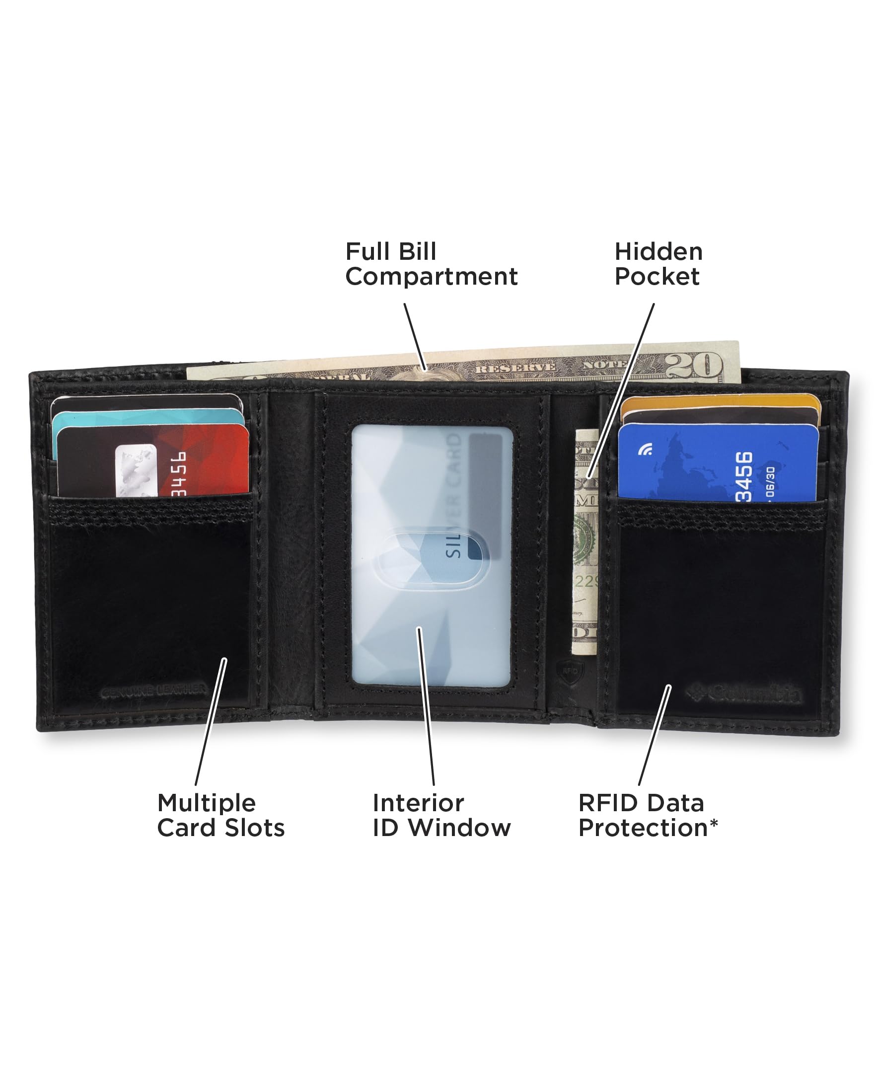 - EVERYDAY FUNCTIONALITY: Enjoy this versatile and durable trifold wallet made for both style and utility. This wallet is carefully designed in classic Columbia fashion to safely store all of your essentials