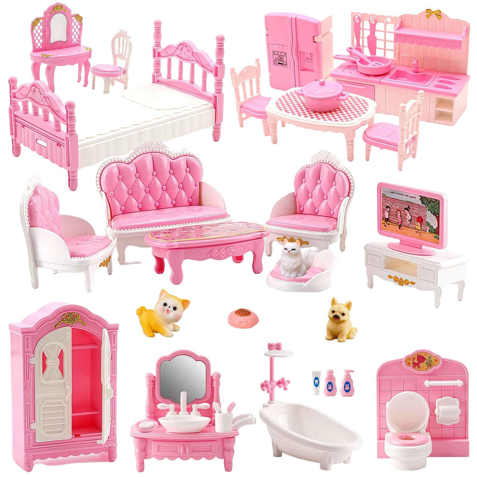 Details: 36Pcs Dollhouse Furniture Set,Miniature 1:12 Scale Dolls House Accessories with Cat,Dog,Kitchen, Dining Room, Living Room,Bedroom for Playhouse Toy (Pink)