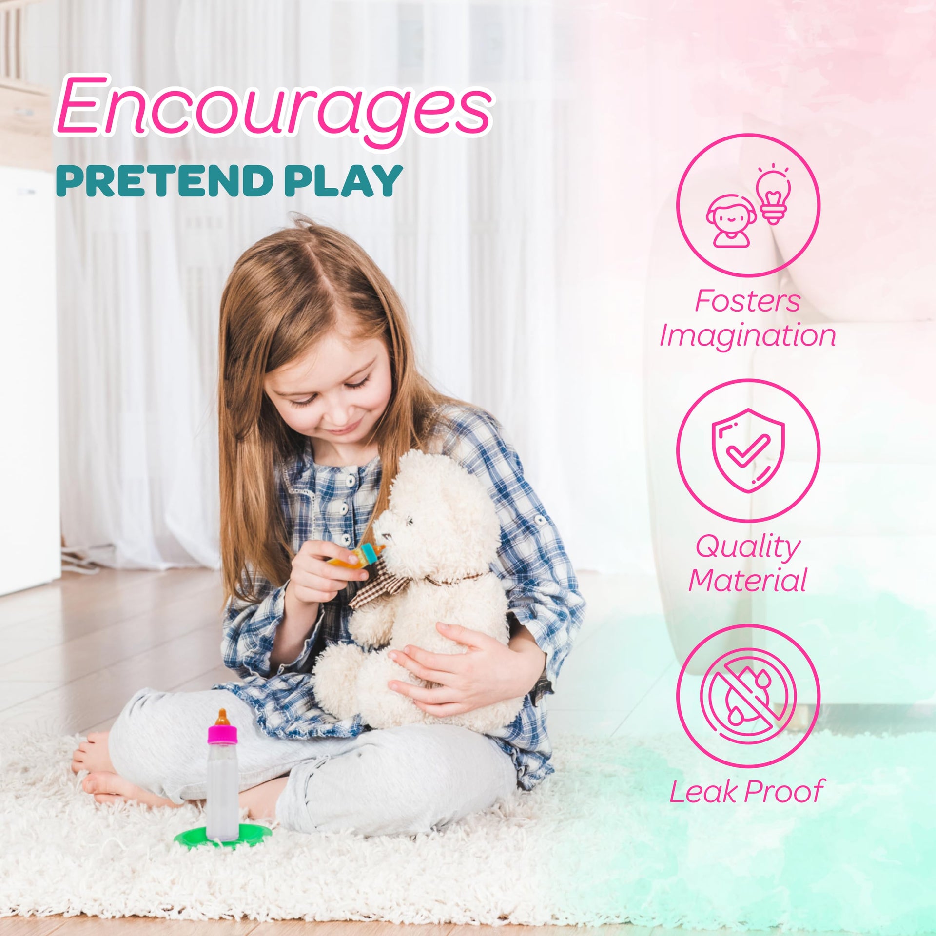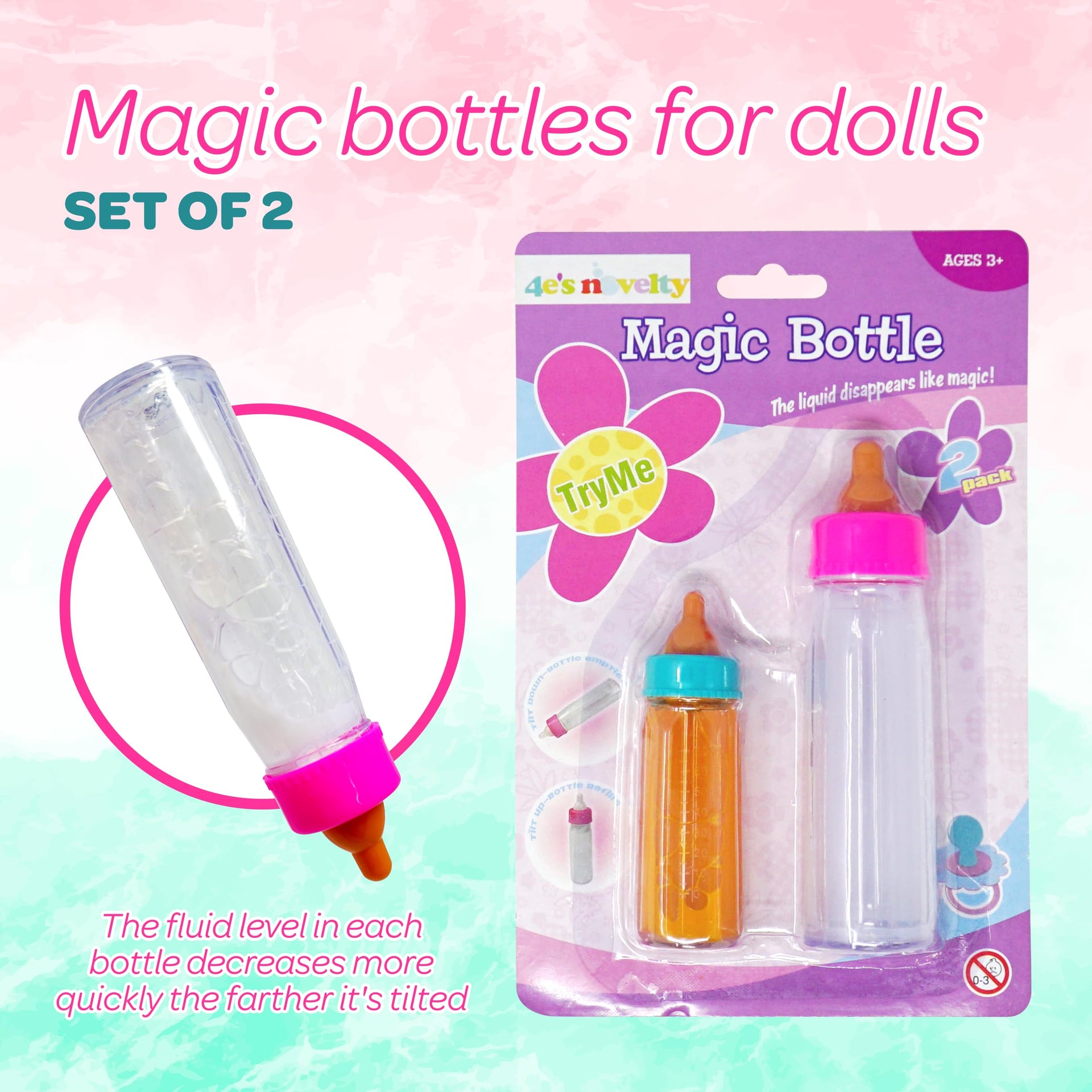 4E's 2-Pack Baby Doll Bottles with Magic Disappearing Milk & Juice – Doll Accessories Toy for Toddlers & Kids, Gift for Ages 3-7