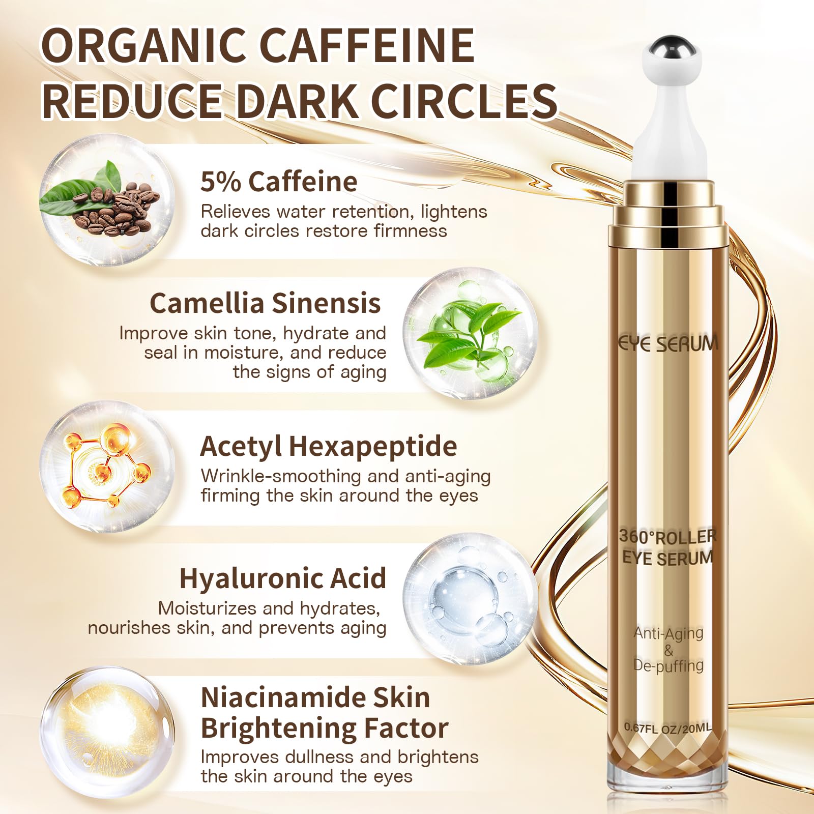 5% Caffeine Eye Serum 20ML with Hyaluronic Acid, 360° Massage Ball for Dark Circles, Puffiness, Wrinkles & Fine Lines