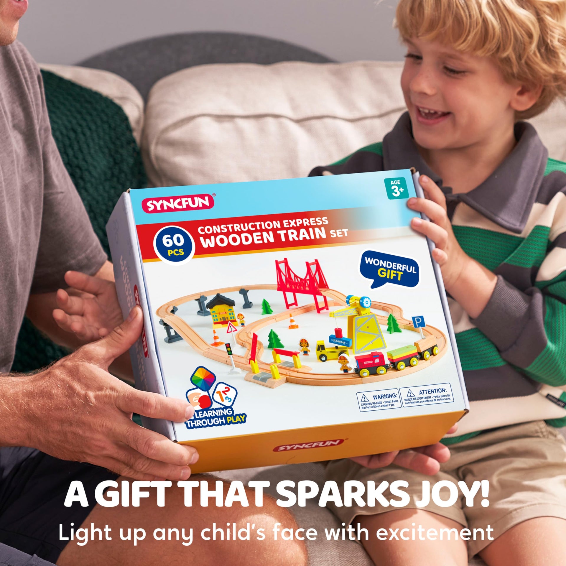 60PCS Wooden Train Set - Construction Express Railway with Magnetic Crane, Trains & Accessories, Fun Birthday & Christmas Gift for Kids 2-8