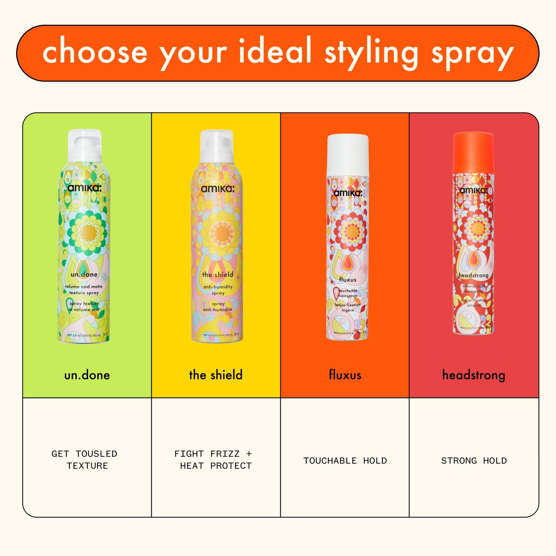 Amika anti-humidity spray bottle with colorful floral design on a white background