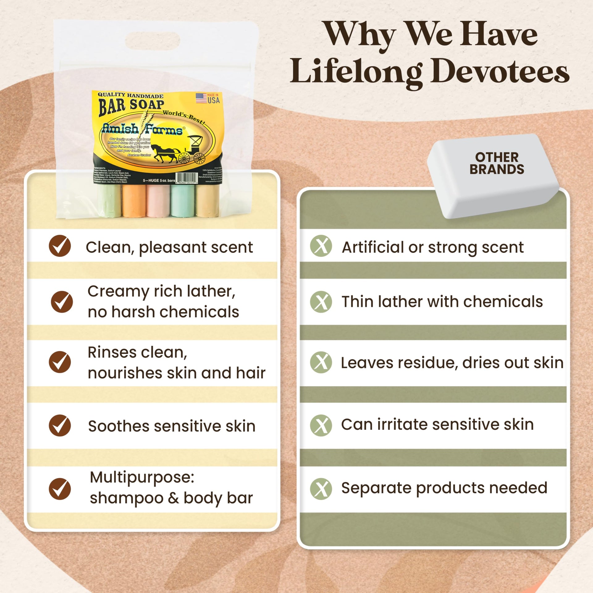 - EXPERIENCE AUTHENTIC AMISH FARMS SOAP: Our soap is crafted with strict quality standards to provide a rich lather and long-lasting bars. Plus, we standby our Lifetime Customer Satisfaction Guarantee -questions? Our friendly support team is always ready to assist!