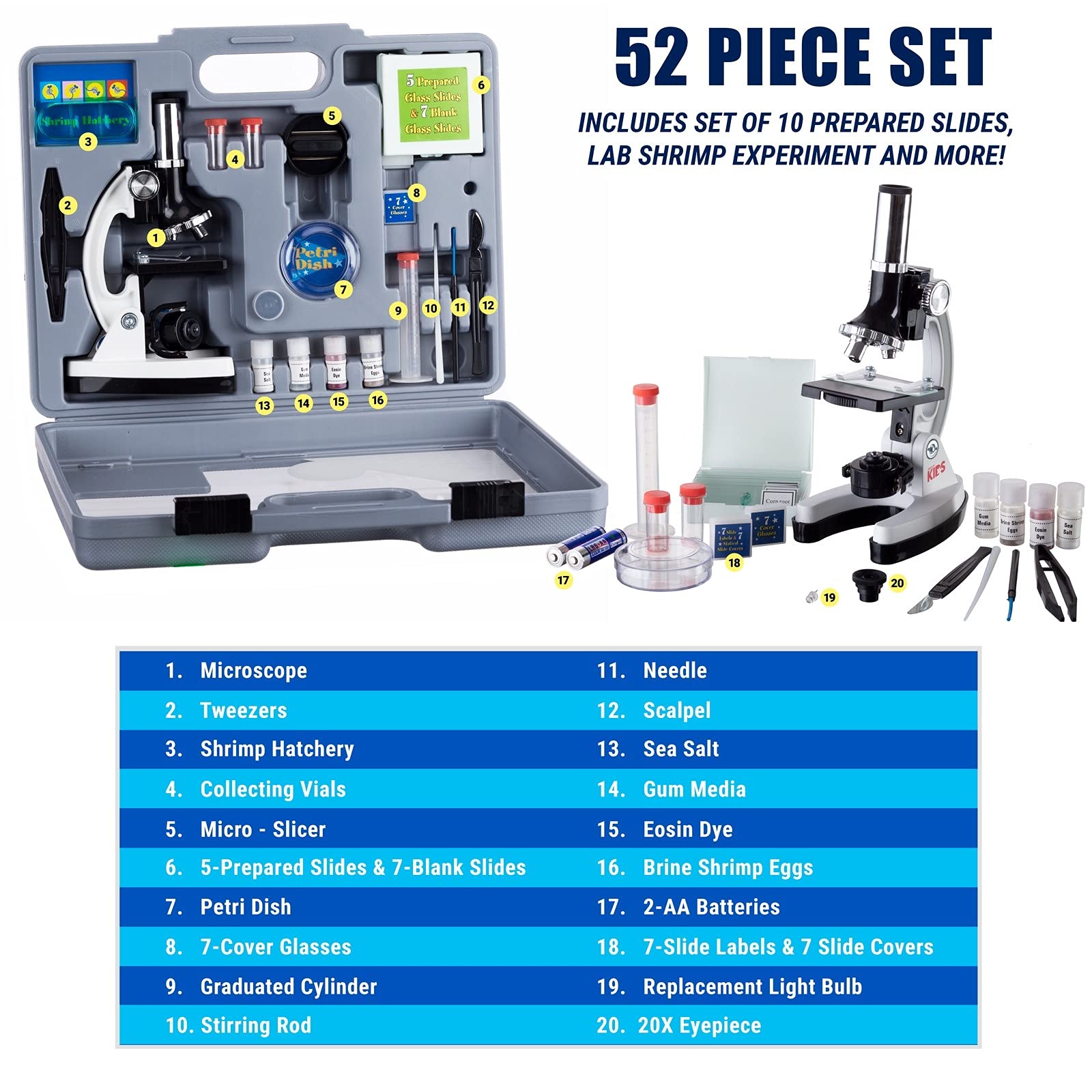 AmScope 120X-1200X 52-pcs Beginner Microscope STEM Kit with Metal Body Microscope, Plastic Slides, LED Light and Carrying Box (M30-ABS-KT2-W),White