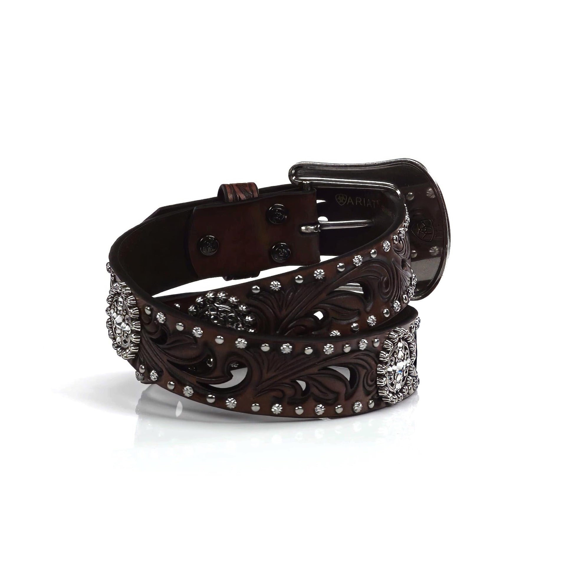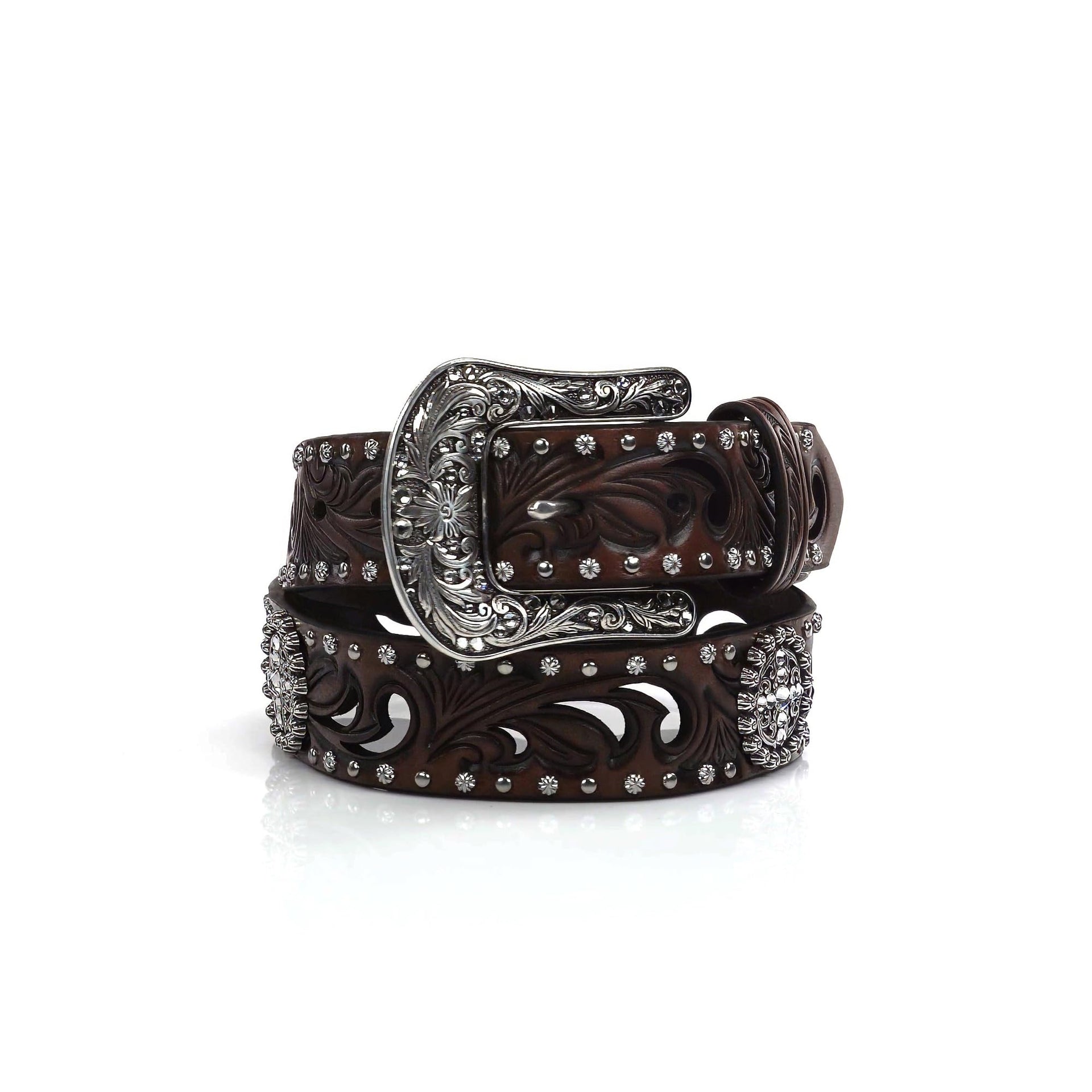 ARIAT Women's Scroll Cutout Concho Nailhead Edged Belt, Brown, Medium