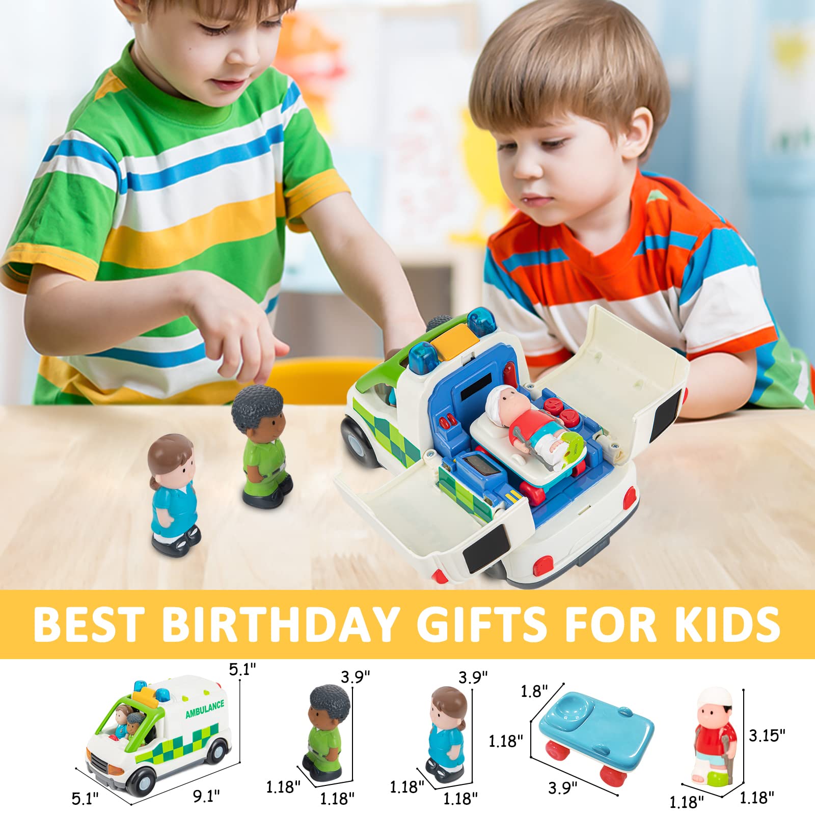 - 【Lights And Sounds】Good Performance Simulation ambulance light. For even more fun, the ambulance is equipped with LED lights and 3 different sound effect. Just press a button on the top of the ambulance and the light and sound effects begin to play.lights, sounds effects,realistic details and durable quality, the Auspint toy ambulance is sure to impress