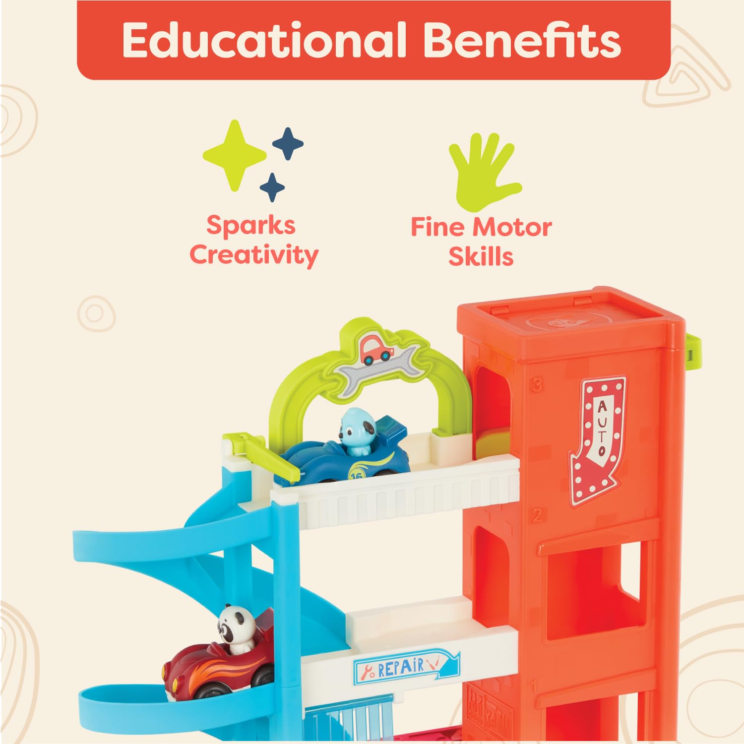 B. toys – Bingo’s Garage – Vehicle Playset Car Garage with Spiral Ramp – Working Elevator with 2 Toy Cars – 3 floor playset – 18+ Months