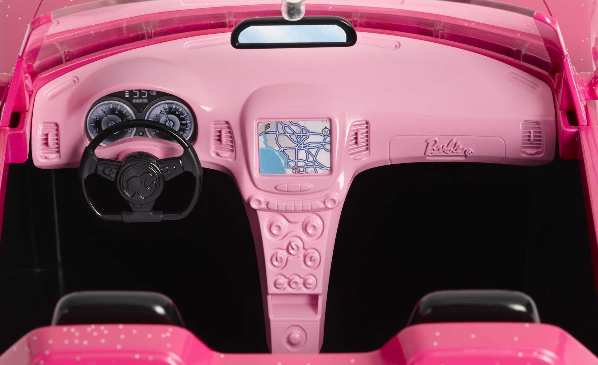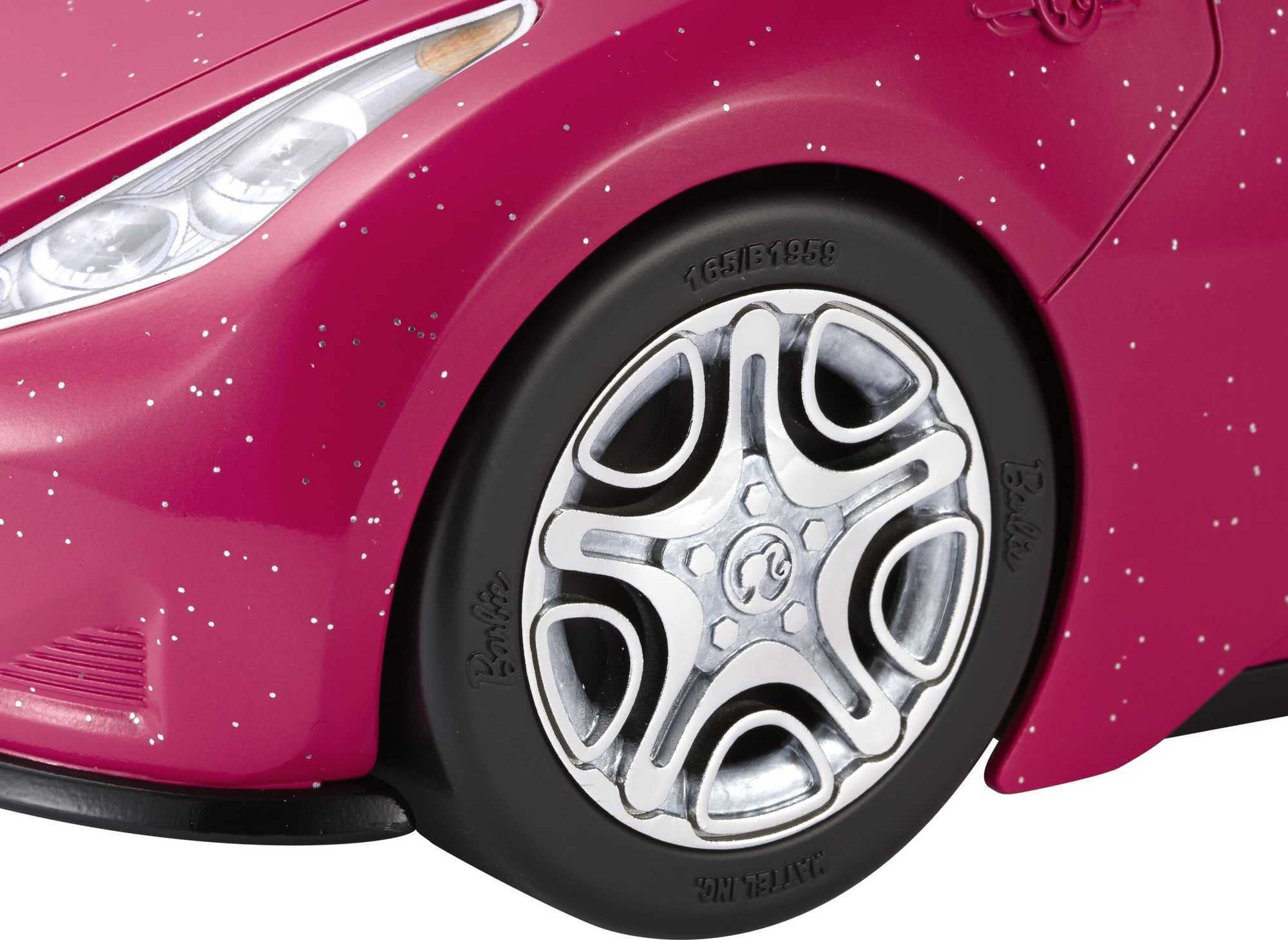 Details: Hit the open road with the Barbie convertible -the storytelling possibilities are endless! Designed in sparkly pink with the Barbie silhouette as hood ornament, the two-seater vehicle is Barbie signature style. The car’s sporty shape has a spoiler in back and silvery wheels that really roll. The interior is modern in black with realistic upholstery labels and seatbelts for the dolls (sold separately). Push the convertible to drive wherever imagination can take you because with Barbie, anything is possible! Includes Barbie glam convertible; doll not included. Colors and decorations may vary.