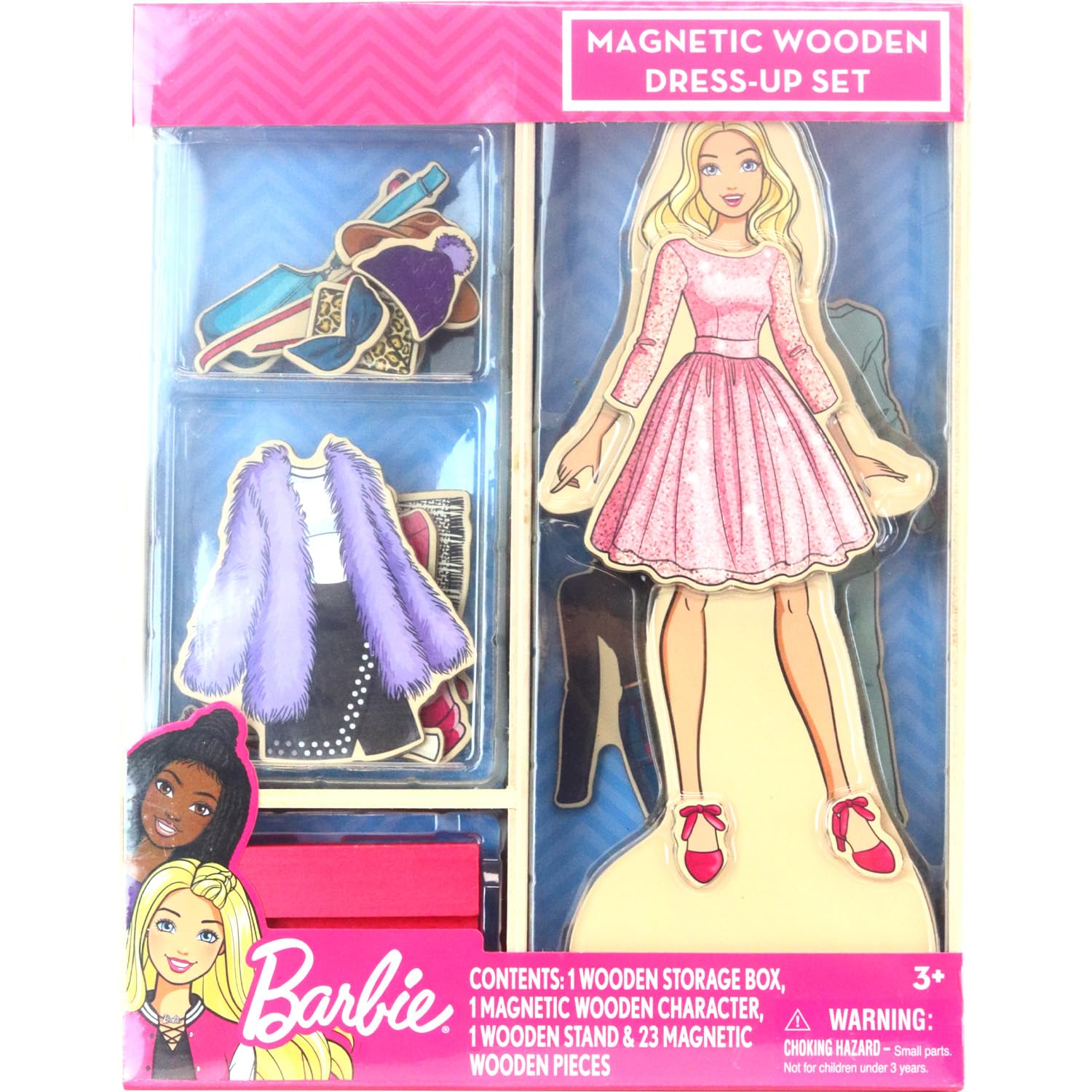 Barbie Magnetic Wooden Dress-Up Set – Wooden Doll with Mix & Match Outfits, Storage Box, Educational Pretend Play Toy for Girls 3+