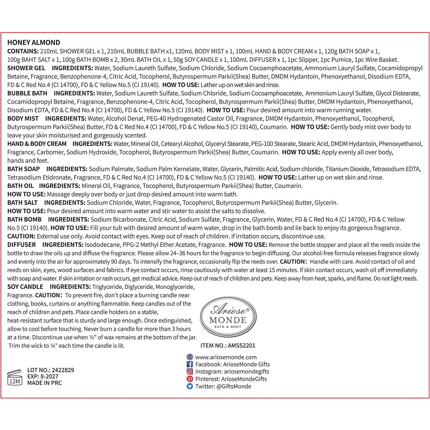- NO RISK PURCHASE: We are confident that you will be happy with this Bath Gift Basket! However, if you still have any questions, please feel free to contact us, we will do everything we can to make it right! Thank you for choosing ArioseMonde