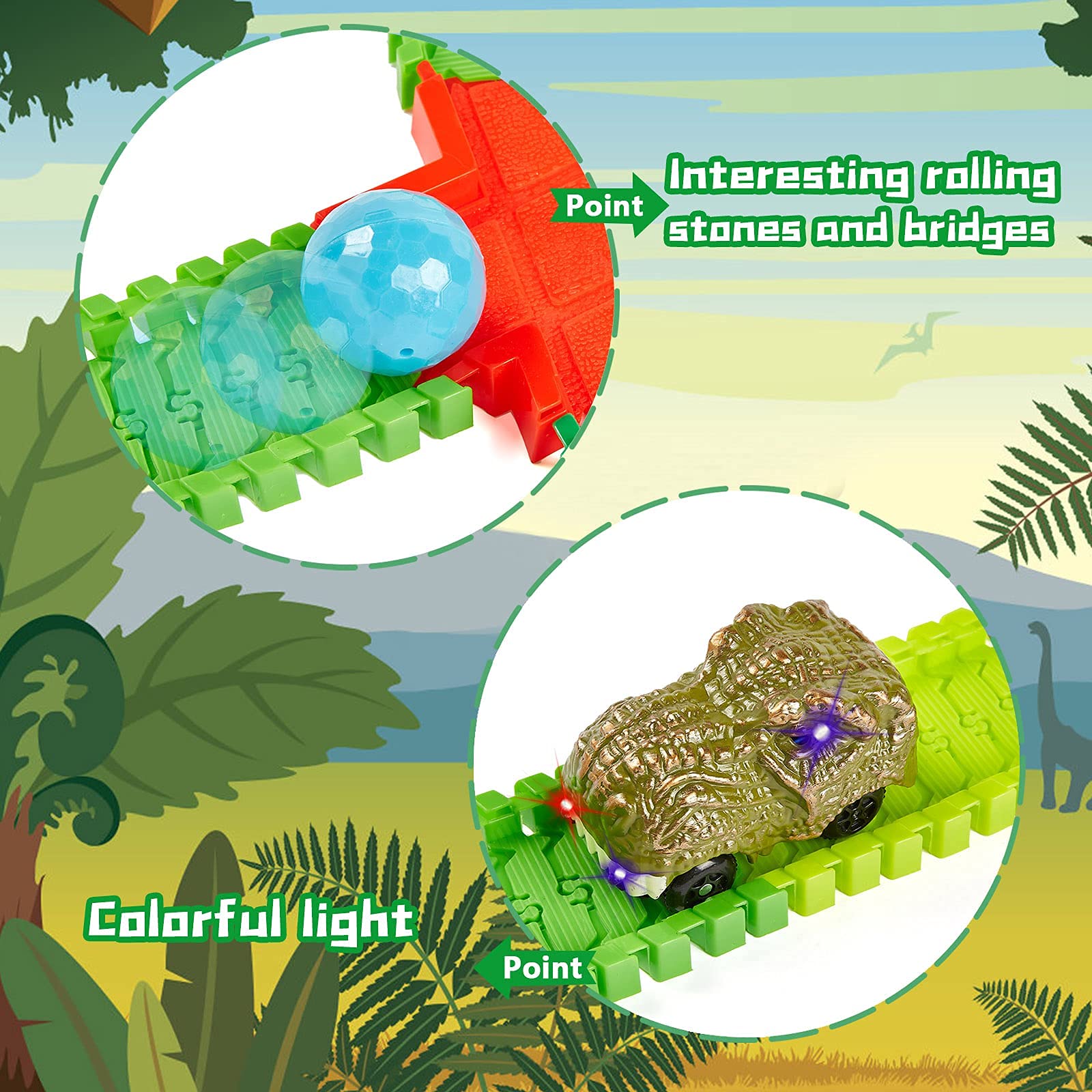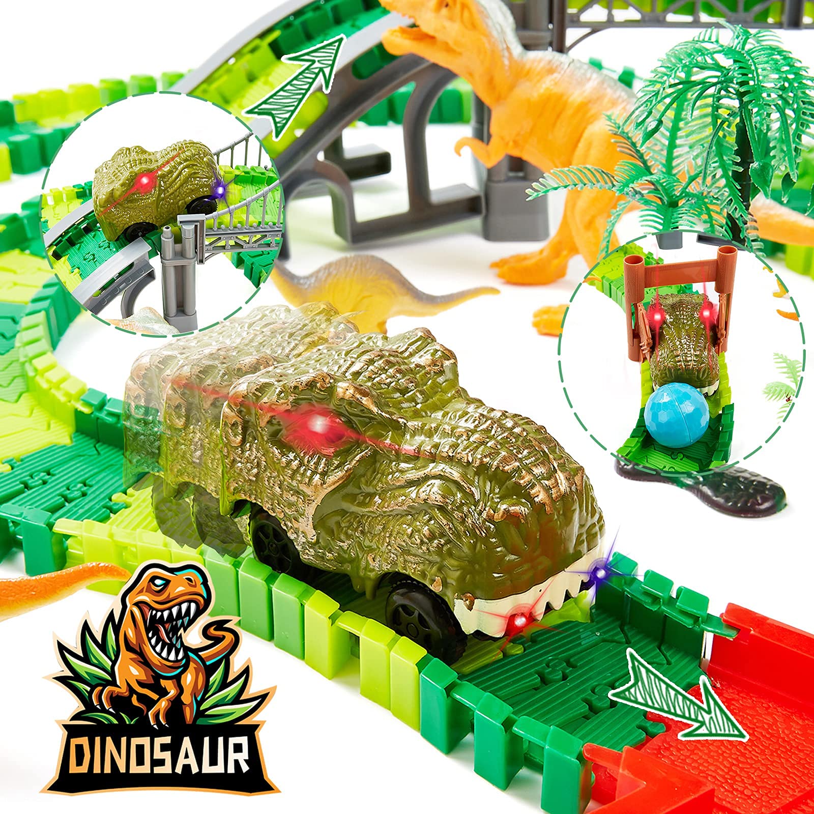 BEMITON Dinosaur Race Car Track Set – Flexible Dino Road Adventure Toys for Boys & Girls Ages 3-7, Perfect Christmas & Birthday Gift