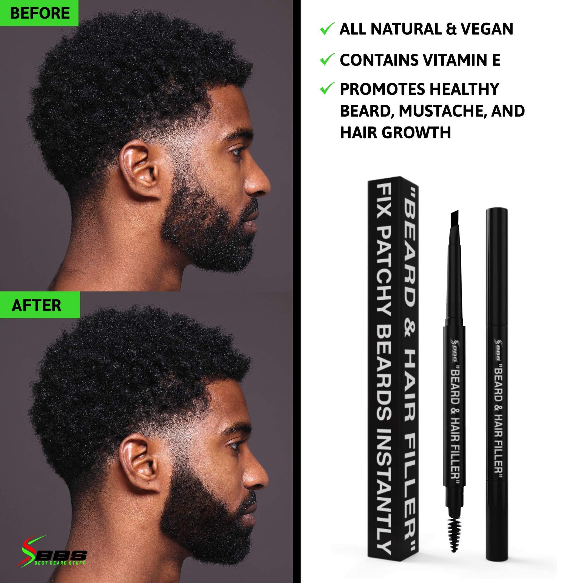 - Best Beard Stuff BEARD & HAIR FILLER is a must-have in every man's grooming routine. Our product is designed to provide excellent coverage and natural-looking results. Whether you're looking for a quick fix for your patchy beards and mustache or want to enhance your beard's fullness and definition, our beard filler is the perfect solution. Our all-natural, vegan formula means that you can feel good about what you're putting on your skin.