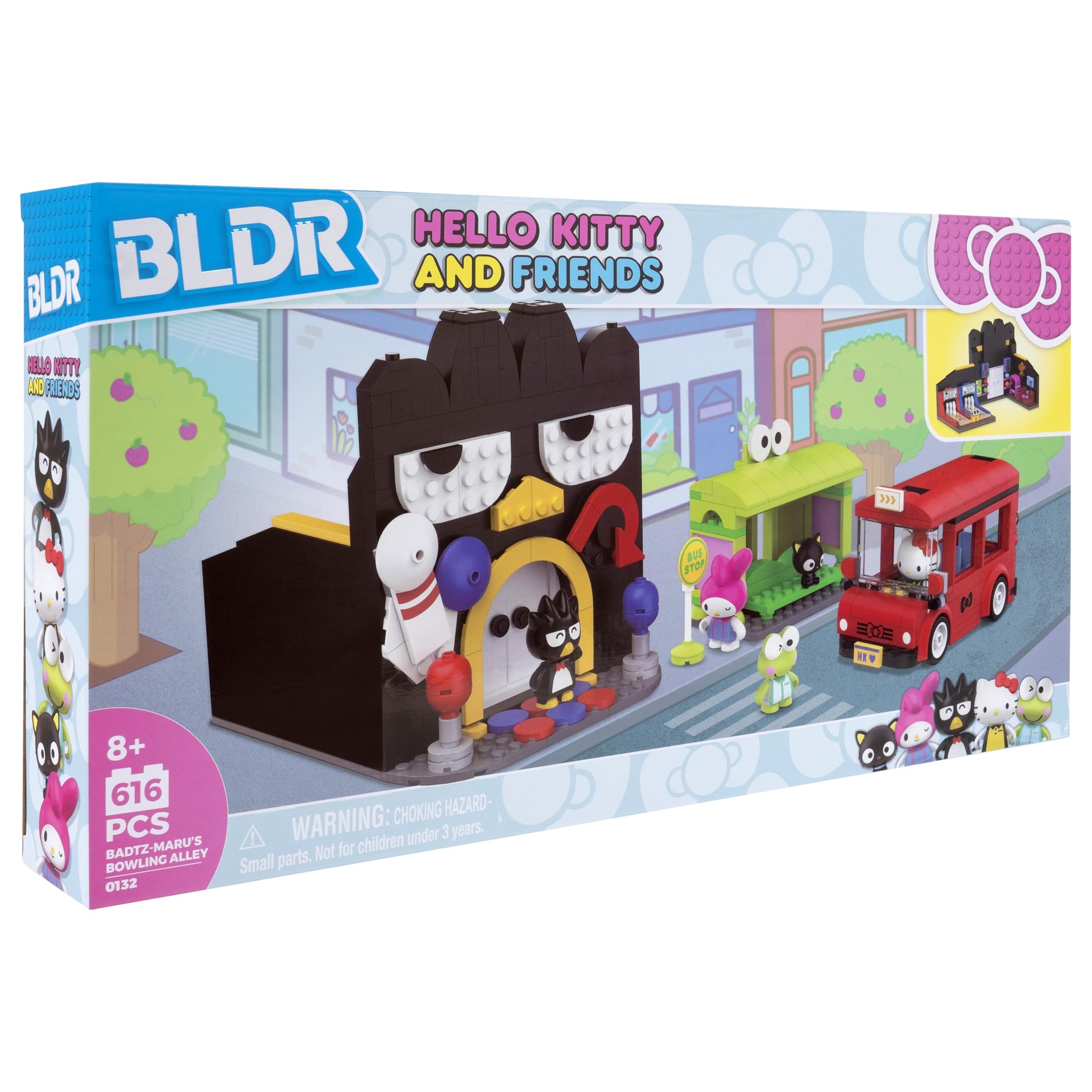 Details: Strike Up Some Fun at Badtz-maru’s Bowling Alley! Roll into an exciting world of bowling bliss where your favorite Sanrio friends are ready to hit the lanes! With a dazzling set of 616 colorful pieces, you can build the ultimate bowling experience featuring posable minifigures of Hello Kitty, Keroppi, Badtz-maru, My Melody, and Chococat. Get ready to unleash your competitive spirit as you step through the opening double doors of the extra large Badtz-maru inspired building into a vibrant bowling paradise! The interior is packed with irresistibly fun details—a shining league trophy, a cozy lounge area, and a jukebox “playing” all your favorite tunes! Let the games begin with two exciting bowling lanes, including a blue lane perfect for setting up and knocking down those pins! After your friends finish bowling, send them home on the iconic Hello Kitty-themed bus that seats up to three. Other friends can wait for the next bus at the adorable Keroppi-themed bus stop! All BLDR bricks are compatible with major construction brands, so brick by brick, build out your Hello Kitty and Friends collection. Grab your team, and let the good times roll! Strike it rich in fun and laughter at Badtz-maru’s Bowling Alley!
