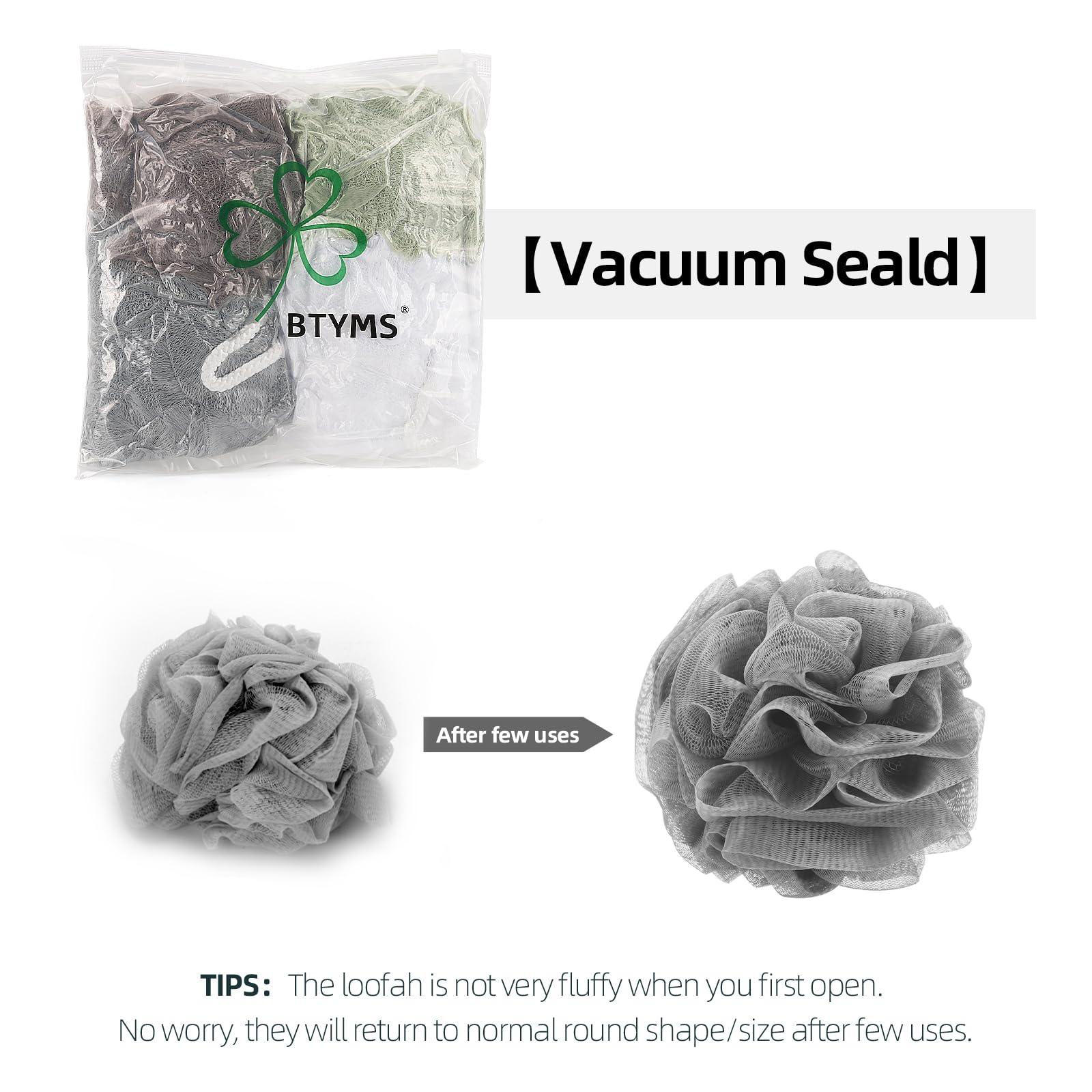 - Vacuum Seald: The loofah is not very fluffy when you first open. No worry, they will back up to normal round shape/size after few uses