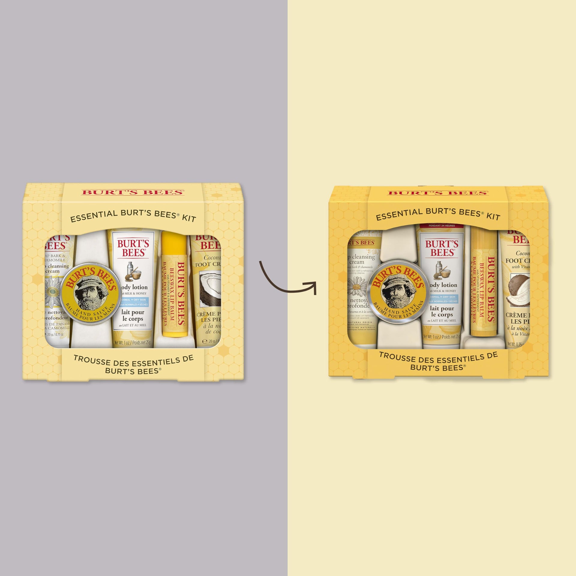 Details: Get the spa treatment at home with Burt's Bees Essential Beauty Gift Set which includes 5 trial size products of Burts Bees favorites. Soap Bark and Chamomile Deep Cleansing Cream gently removes makeup and dirt, while nourishing Milk and Honey Body Lotion and Coconut Foot Cream work to moisturize and smooth dry skin. Plus, Hand Salve in this Burts Bees kit pampers hands, and Beeswax Lip Balm soothes dry lips. This natural beauty set makes the perfect birthday, holiday or Mothers day present, and sweet packaging is gift ready so you can skip the wrapping. Give the gift of nourishment with Burts Bees skin care products.