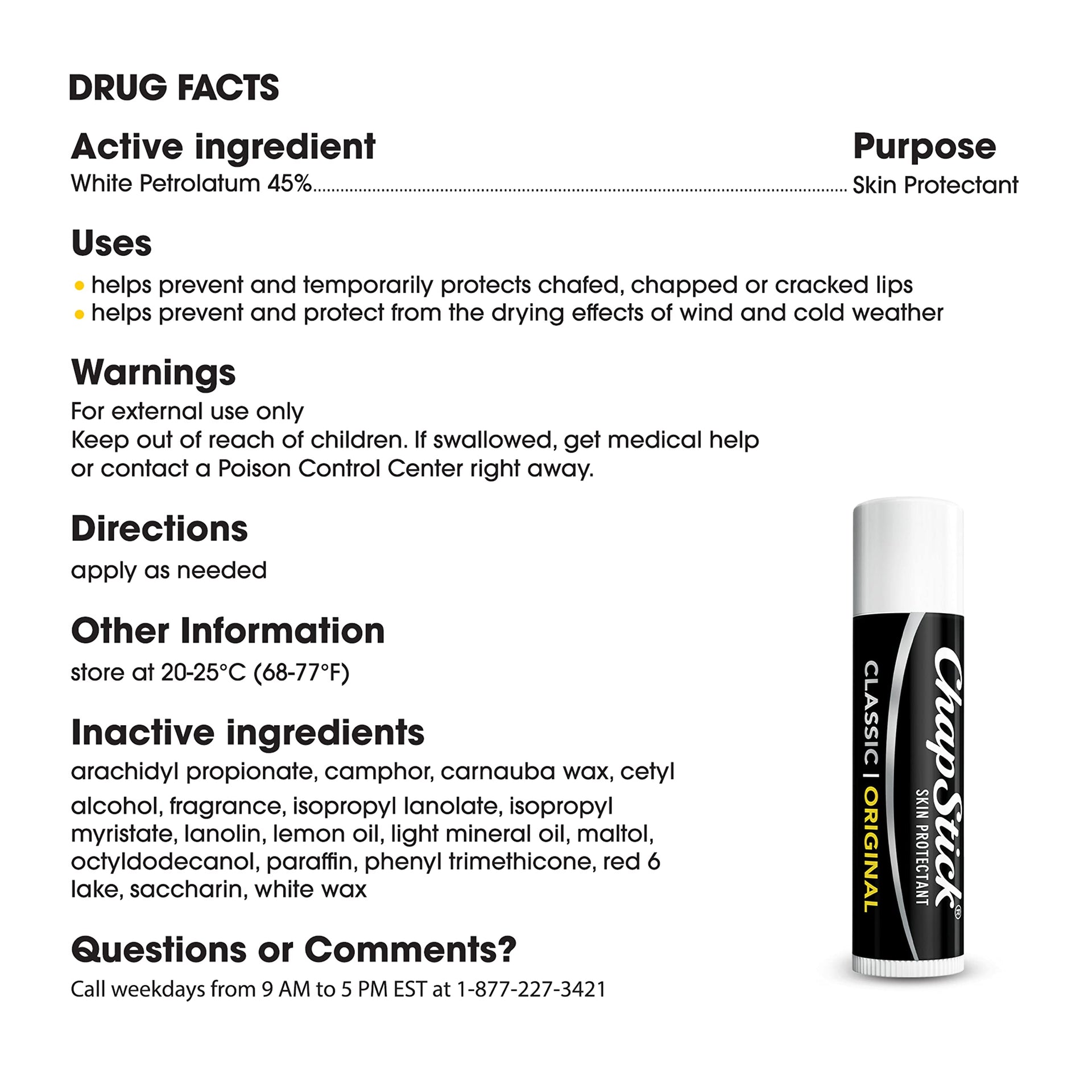 Details: When it comes to caring for your lips, you can't go wrong with a classic. ChapStick Classic Original is the one you know and love. It's the lip protection you grew up with, that trusted tube you've turned to time after time. America's favorite lip balm, ChapStick Classic Original for lips glides on easily to soften and protect delicate skin. Use as directed to help heal or prevent dry, chapped lips, and apply it daily to help keep lips silky smooth. Through every season, at home or on the go, trust ChapStick Classic Original lip balm for everyday comforting lip care. ChapStick Classic is available in Original, Cherry, Strawberry and Spearmint varieties. ChapStick - Skincare for Lips.
