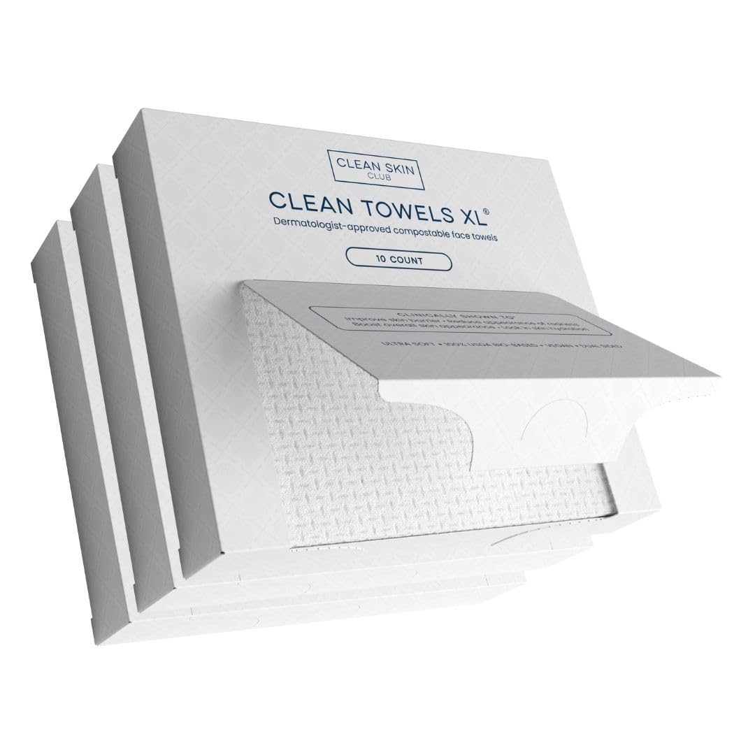Clean Skin Club Clean Towels XL® – 100% Biobased Disposable Face Towelettes, Eczema-Friendly, Makeup Remover, 30 Count (3 Packs)