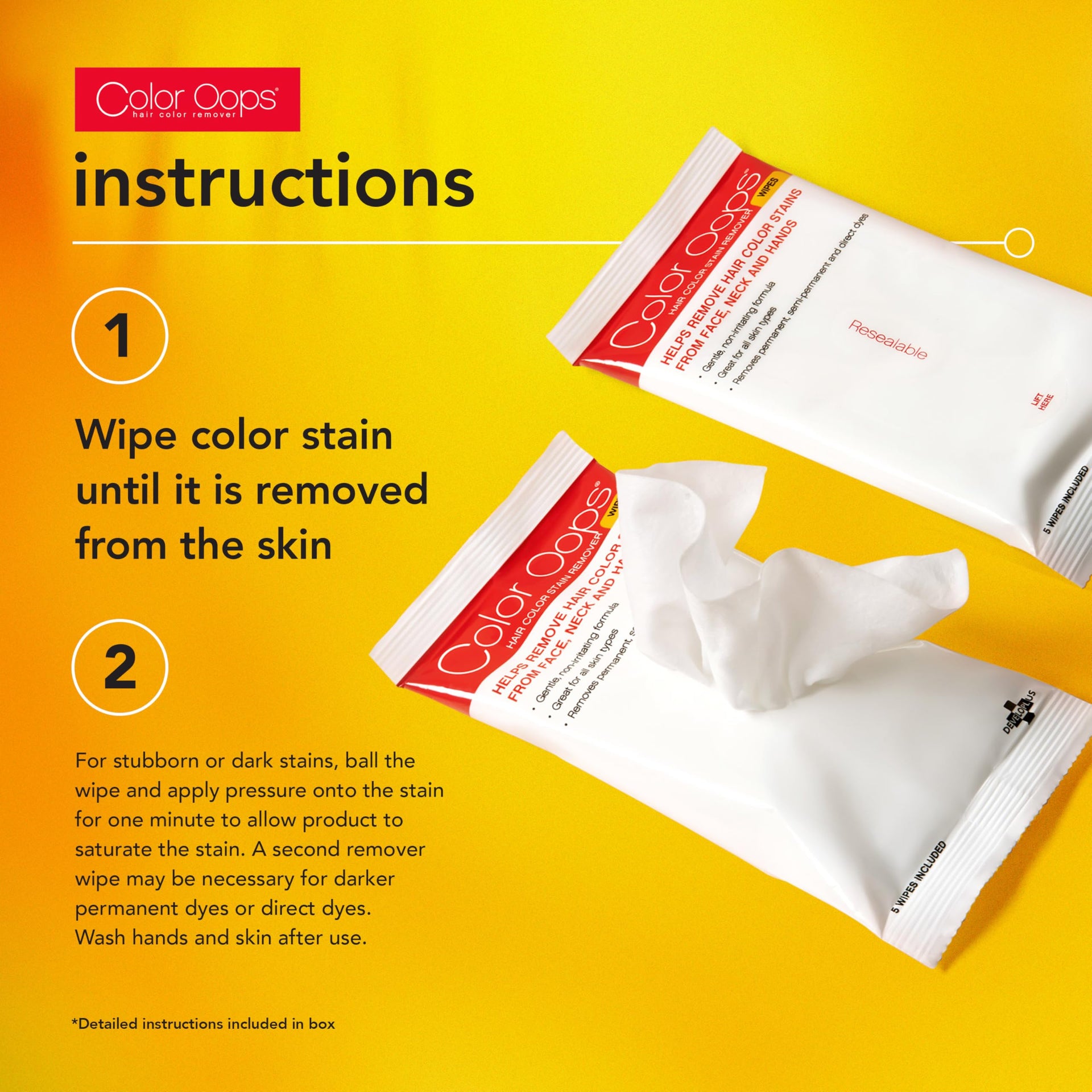 - RESEALABLE CONVENIENCE: Available in a 5-count, resealable package, keep these Color Oops wipes on hand for whenever you color or dye your hair. Reseal wipes to preserve moisture.