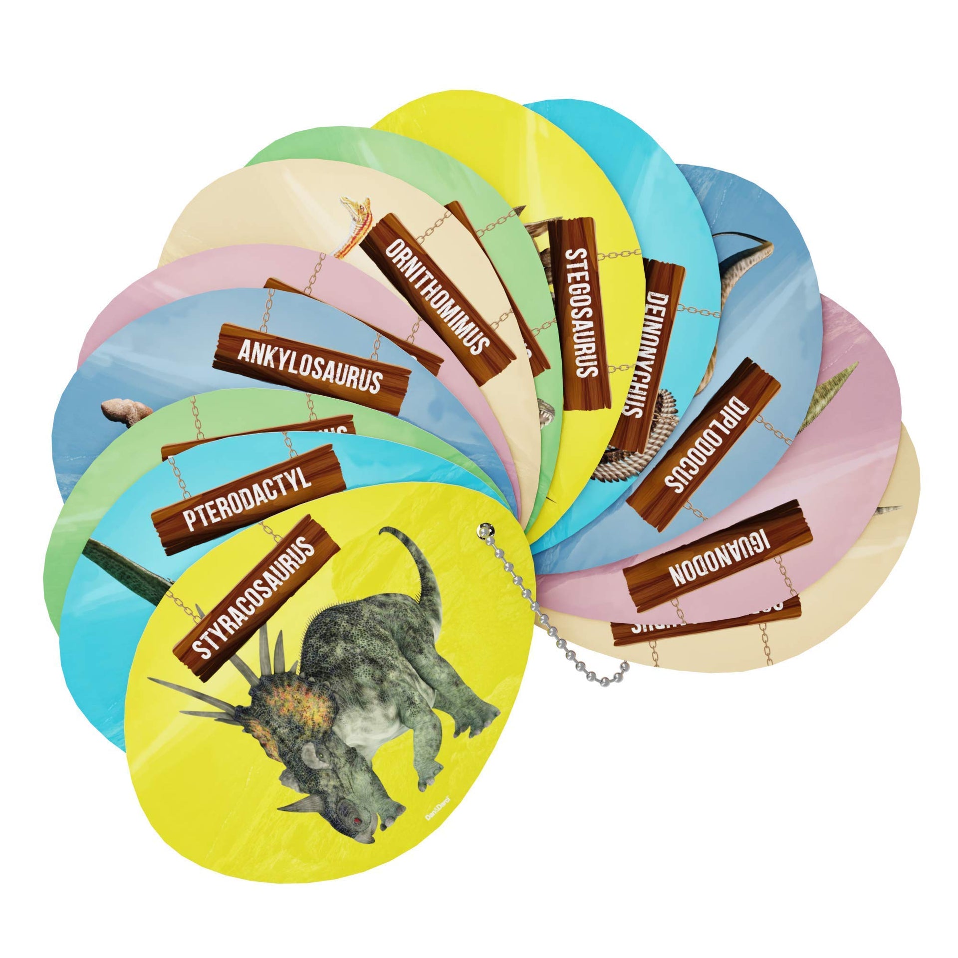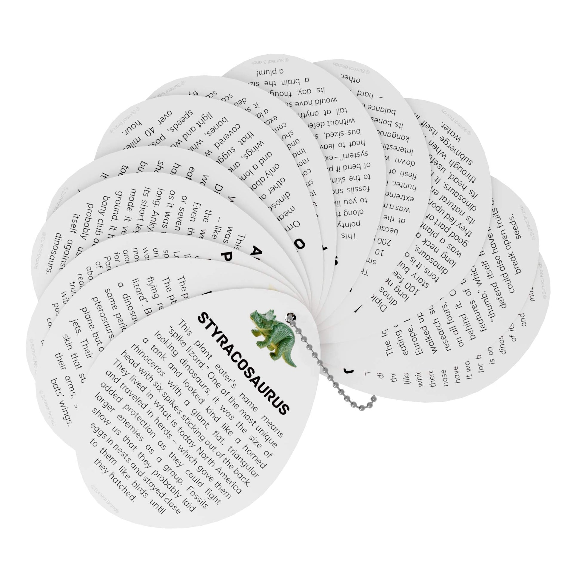 - 12 full-color dinosaur learning cards: Includes 12 beautiful cards on a chain, each describing the history of a different dinosaur. After digging up a dino, try to match up the appropriate card to your dinosaur and learn more about it.