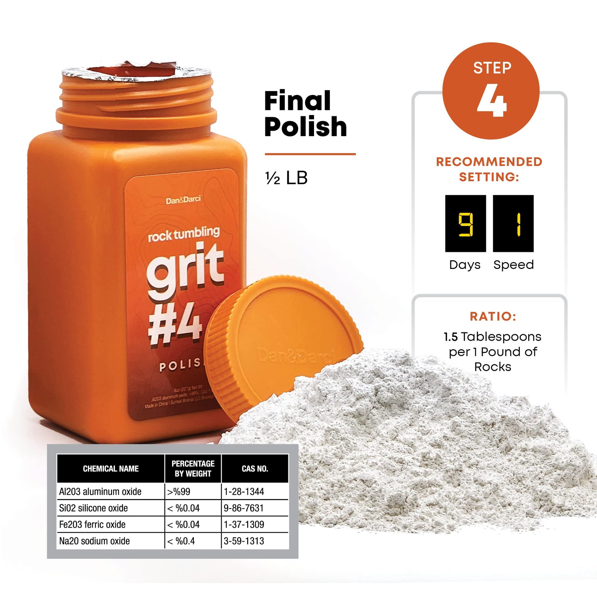 - Complete rock tumbling medium kit: 3.5 lbs. 4-step grit set and poly plastic pellets, to polish any rock. Packaged in easy-to-use-and-store bottles