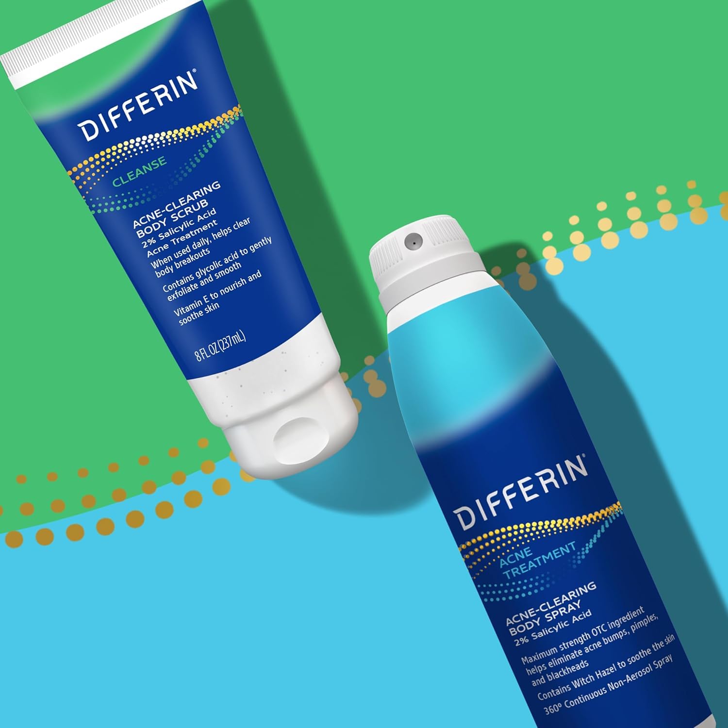 Details: Differin Acne-Clearing Body Spray is a super-fine, easy-to-use mist that clears acne blemishes on the body, leaving skin looking clearer and feeling soft. Its 360ÔøΩ continuous spray gets to even the hard-to-reach areas from the neck down, effectively treating and preventing body breakouts from any angle. Plus, it features the maximum strength, over-the-counter ingredient 2% salicylic acid to help eliminate acne bumps, pimples and blackheads. It also contains 3% glycolic acid, which gently exfoliates dead skin cells to help reduce the appearance of marks and dark spots left behind by acne, and 2.5% witch hazel, which helps reduce excess surface oil and minimizes the appearance of pores. Because drying of the skin may occur, start with one application daily, then gradually increase to two to three times daily if needed. With a fast-drying effect, it's perfect for use on the go and post-workout applications.