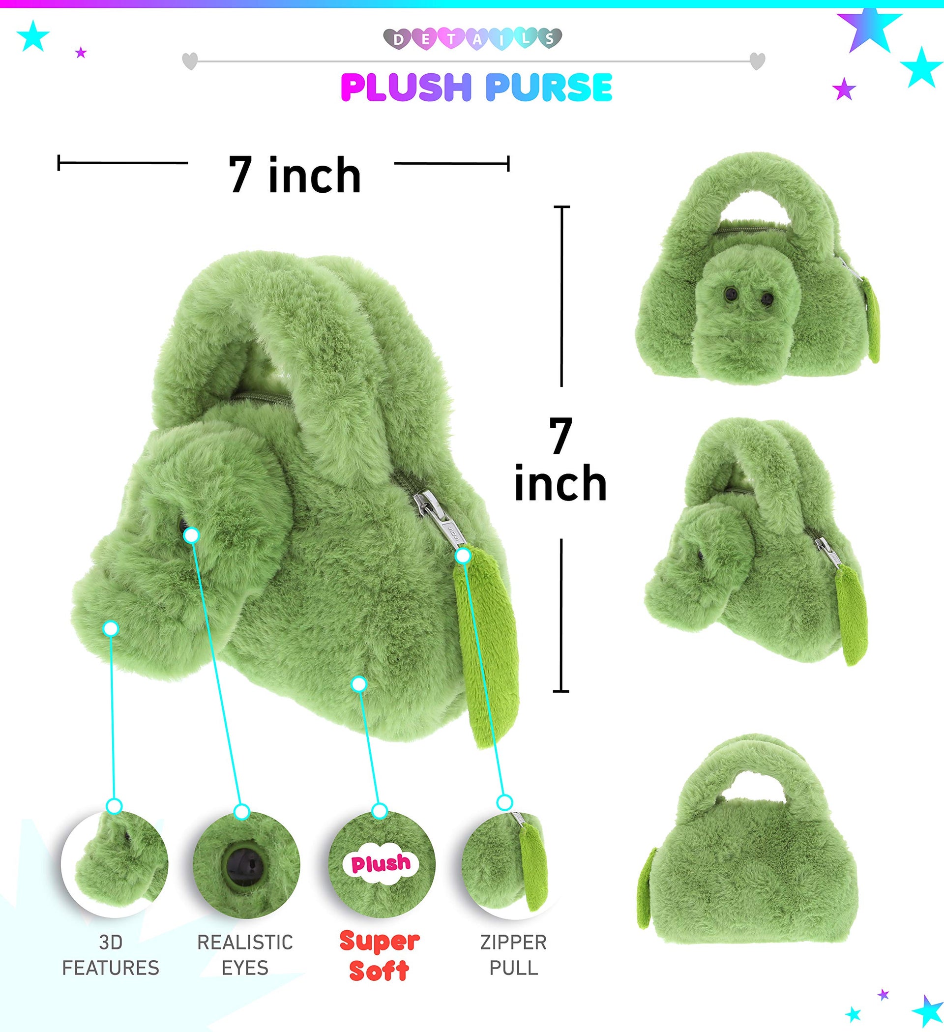 - INCLUDED WITH THE PURCHASE OF PLUSH PURSE FOR KIDS - Includes 1 DolliBu Alligator Stuffed Animal Kids Handbag featuring a spacious compartment that can be opened & securely closed by simply pulling the green pom pom zipper on both sides. The bag is decorated with fluffy green plush & a cute alligator head is attached to 1 side of the handbag. The cute alligator purse plush measures about 7″Lx7″Wx4″H inches, perfect for kids' little hands.
